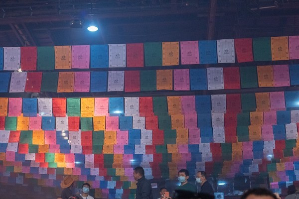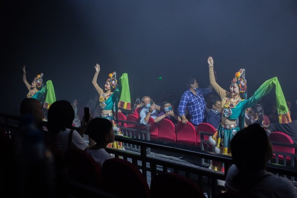 第五场 天地吉祥,在最后的尾声中,在飘扬的经幡下,大家都起身合手,在心中虔诚地为家人、自己、亲朋好友、远方的陌生人许下最真挚的祝福,场面宏伟而肃穆。
