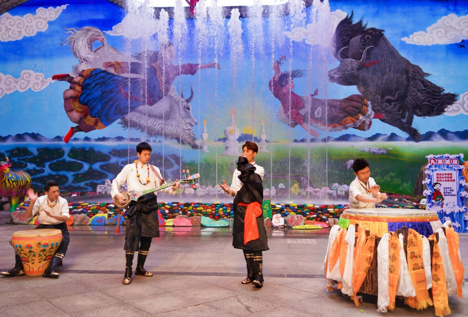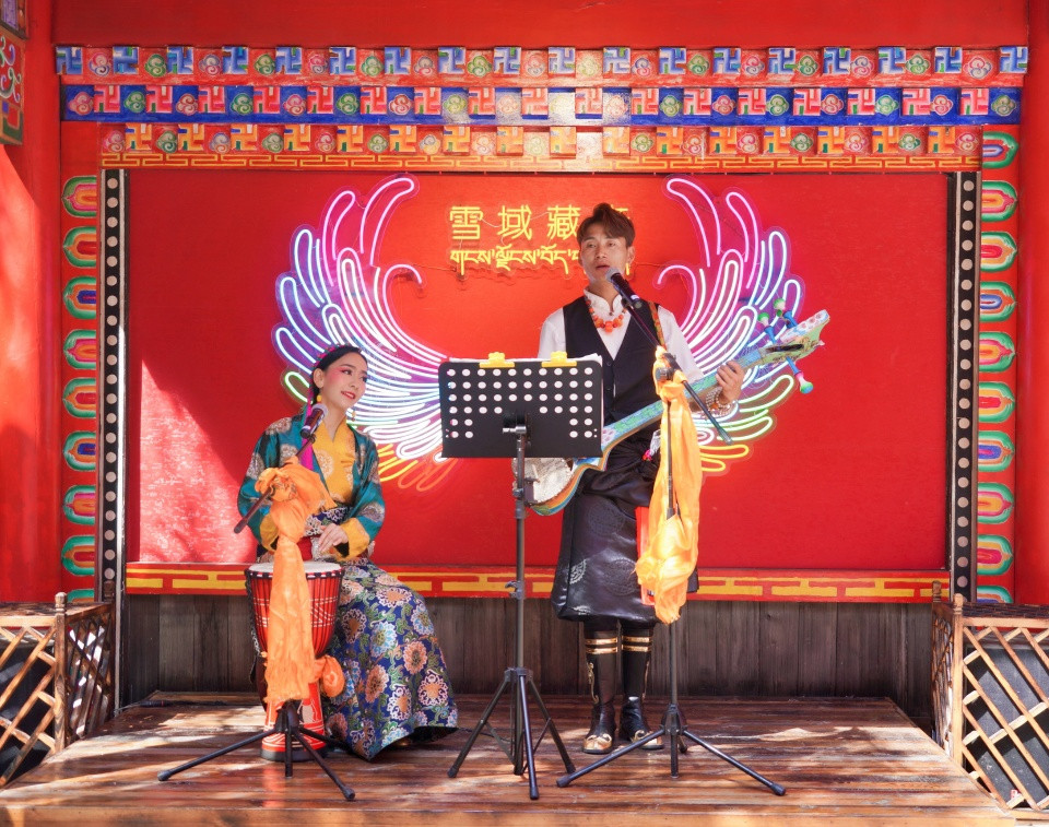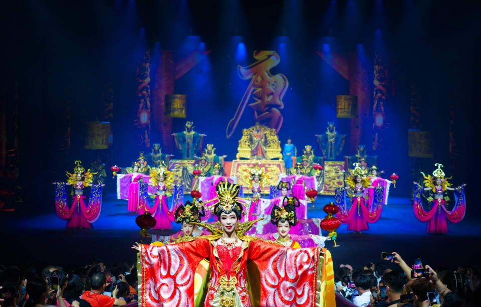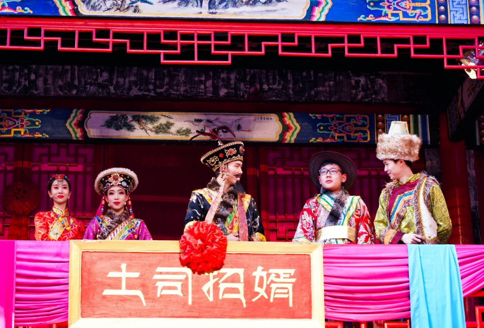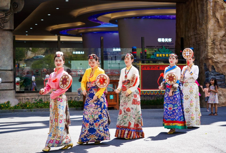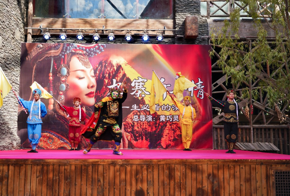 一场场藏羌民族文化艺术“串烧”深入九寨千古情园区,一场接一场的沉浸式互动演艺接踵而至。这里滑稽搞笑的《嗨!牦牛》讲诉了牦牛求偶的故事。这里还有展现藏羌民族服饰、乐曲舞蹈和婚嫁形式的《藏地鼓舞》、《雪域藏歌》、《民族快闪》、《赛装潮趴秀》、《锅庄狂欢》、《土司府擂台比武招亲》。