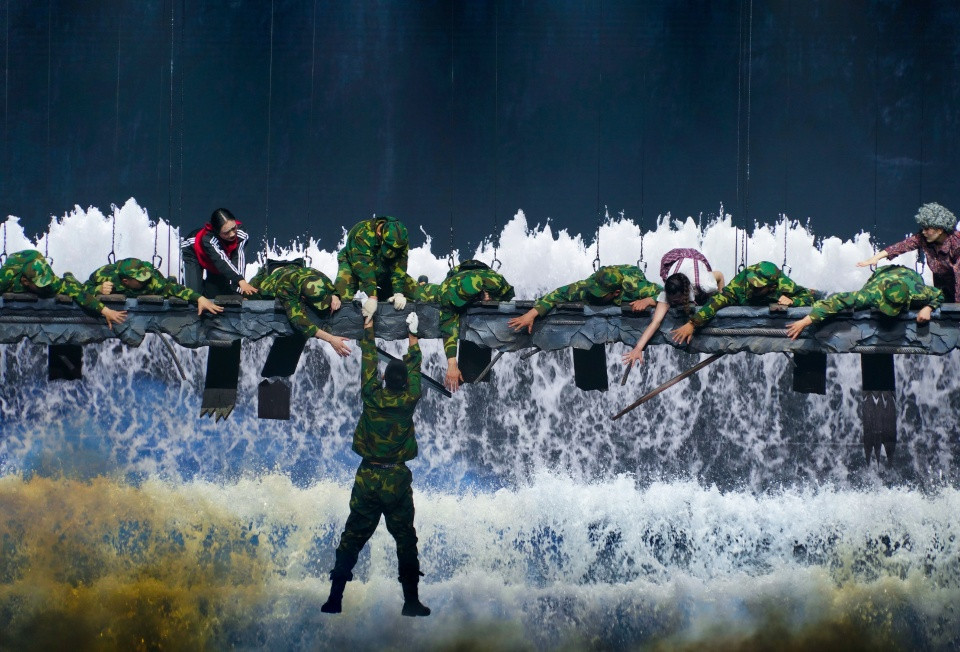 如果要说《九寨千古情》五个章节中,哪一章最精彩,我想一定是真情流露的《大爱无疆》。当时光回转到2008年那个午后,一场巨大的地震发生在蜀地,山崩地裂,高楼倒塌,无数个家庭因此妻离子散。这场演艺用三个真实的故事为主线,讲诉在无情天灾之下人间的亲情、爱情和人间大爱。英勇的解放军战士,舍己为人的坚挺在救援前线,他们从直升机上一跃而下,搭成人形索桥营救灾民,饱含情感的演艺,令人热泪盈眶。对于一个四川人而言,更是感同身受,刻骨铭心。