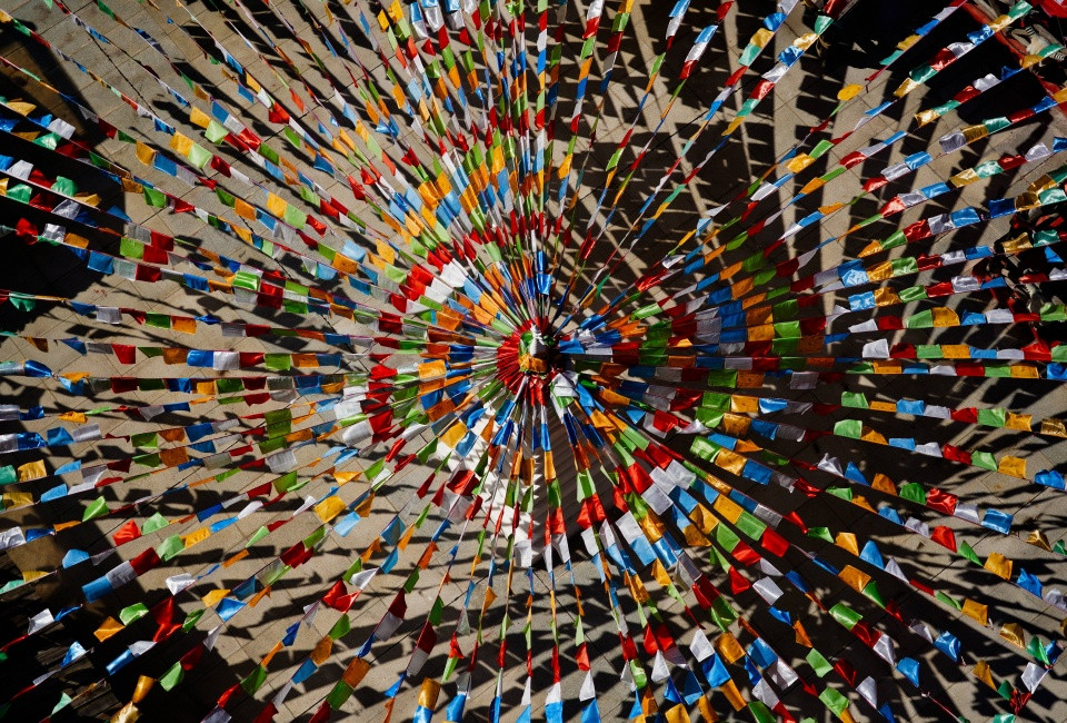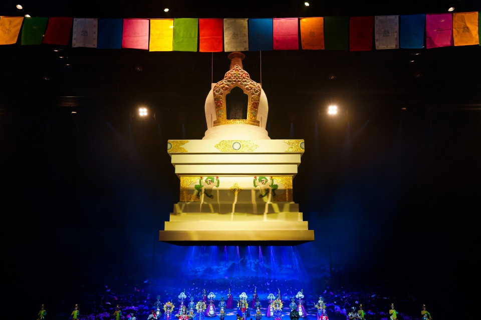 当感天动地的故事在这里汇聚,经天纬地的长歌在这里传颂,锦绣山河美景再此重现,藏羌之地迎来一片《天地吉祥》。一座巨型藏式白塔从天而降,伴随着五彩斑斓的经幡从观众席后方飘来,整场演艺也接近尾声。在这个寓意吉祥的白塔、经幡之下,全场的观众不约而同的起身双手合十许愿,期许着美好与幸福。