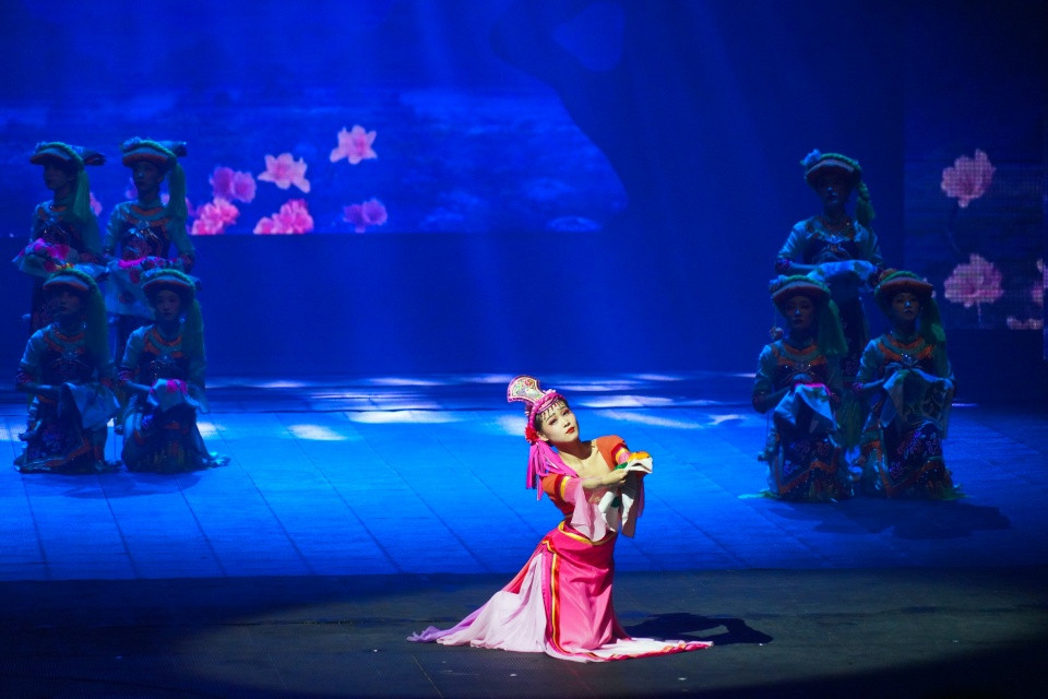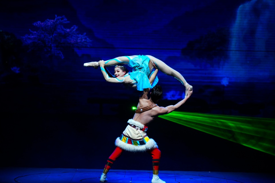 谈及九寨沟的由来,当地曾流传着这样一则传说。相传天上的色嬷仙女与姐妹,因羡慕凡间的爱情与美景,偷偷来到人间,遇到了英勇的藏族青年达戈等人,而后青年男女们坠入爱河。天庭震怒,引一道惊天雷鸣闪电,将色嬷和达戈变为两座雪山,仙女们幻化为海子,藏族小伙们变成了九个寨子。从此雪山、海子、藏寨相依相偎永不分离,这就是《九寨传说》。这个章节以虚实结合的影响,展示了这段凄美的神话爱情故事,给人以“人在画中游,画随人步走”的3D视觉效果,妙趣横生。