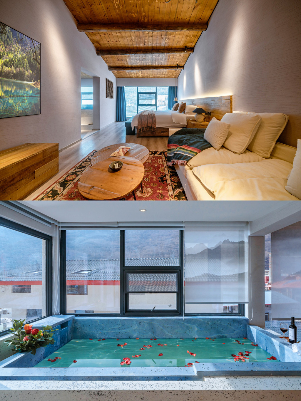 🏘 室内汤池 | 整面落地窗丝毫不影响观景,还能同时一边泡汤一边看电影