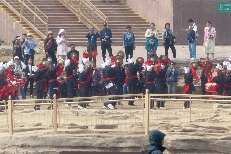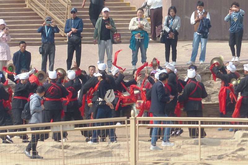 吹唢呐、打腰鼓、唱民歌的老汉(胸前的二维码牌子是收费用的),扮成骑驴回娘家媳妇的游客。