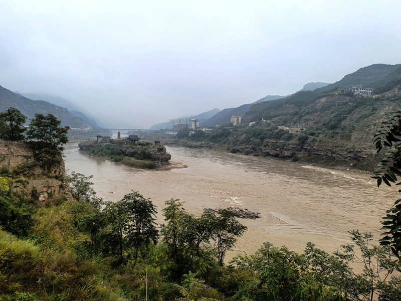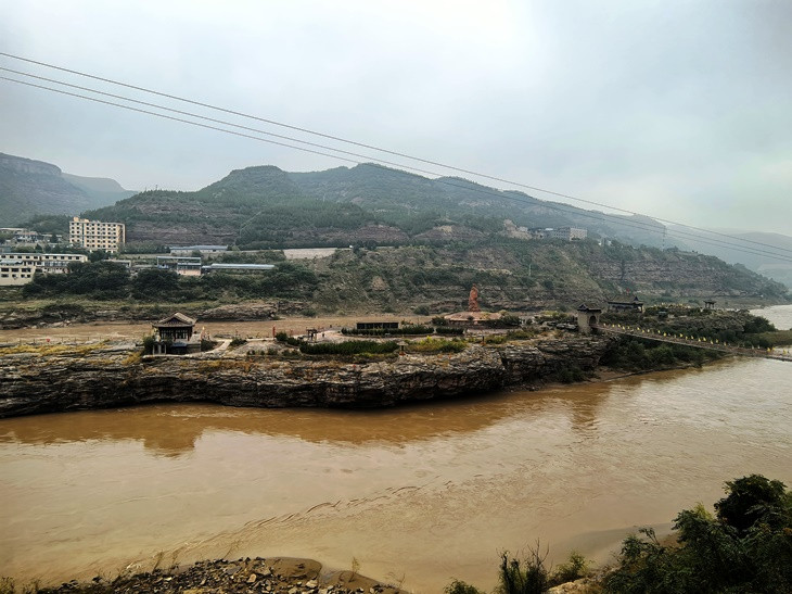 到达壶口景区时天色已晚,入住陕西侧的宾馆,清晨在陕西侧俯瞰黄河,黄河中的小岛是孟门山。小岛上矗立的塑像是大禹。