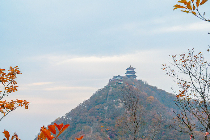 现在正值金秋季节,大自然的力量穿透山林,层林浸染,红色树叶浸染了整片山林,在白色的大雾中,若隐若现。登山过程中,可以看到绝美的秋日景色,黄色中透着红的树木静静的站在那里,背后是巍峨的山脉,几个小山头上建有亭子,连绵起伏的山看不到远方的尽头。