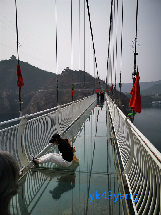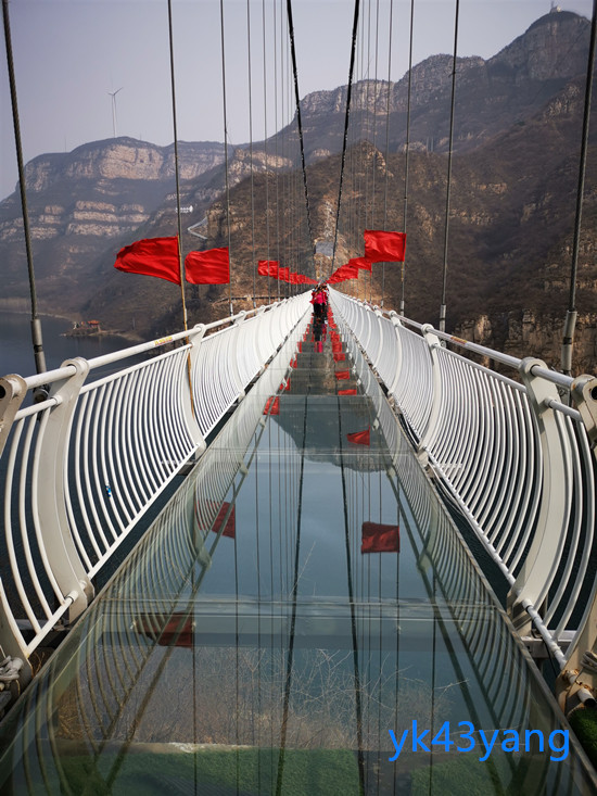 继续行走,来到了连接凤凰山与对面孤山的悬索桥。悬索桥铺的是玻璃桥面,行走其上,非常刺激。也有人说,来到桥面胆战心惊,不敢行走半步。但其实只要坚信桥面的坚固,可以坦然处之。世界上的许多事情也都一样,一切恐惧,皆由心造也!