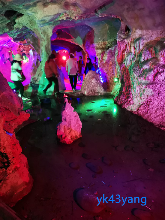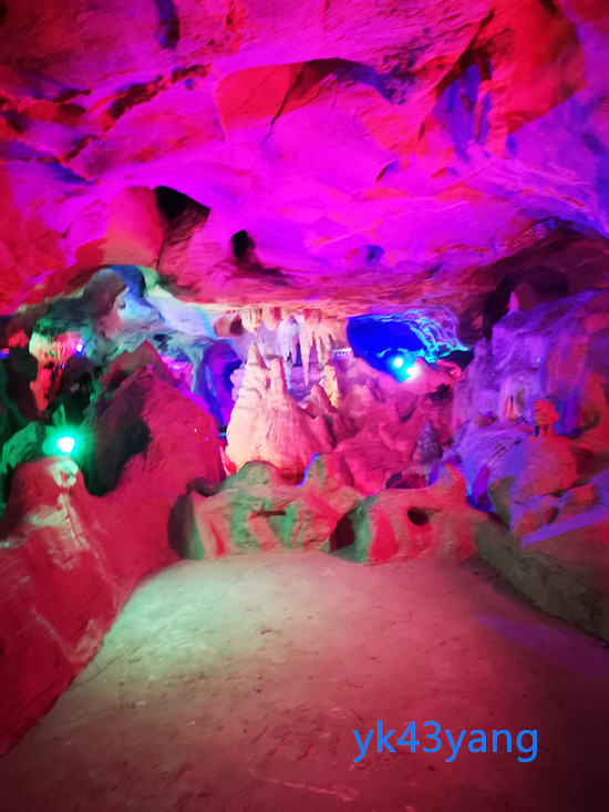 玄天洞是一个天然喀斯特溶洞,全长2000余米,有大小12个厅。进入溶洞,无非是彩色灯光装点的奇石而已,没有多大的看头。然而道路曲折,有时隔着岩洞看去,就是刚才走过的路;有时与走过的路仅仅相隔一尺来高的几块怪石。所以我们是在洞中迂回并非一路向前。洞中没有路标指引,心中不免有些紧张:要是绕回老路陷入了死循环,如何是好?