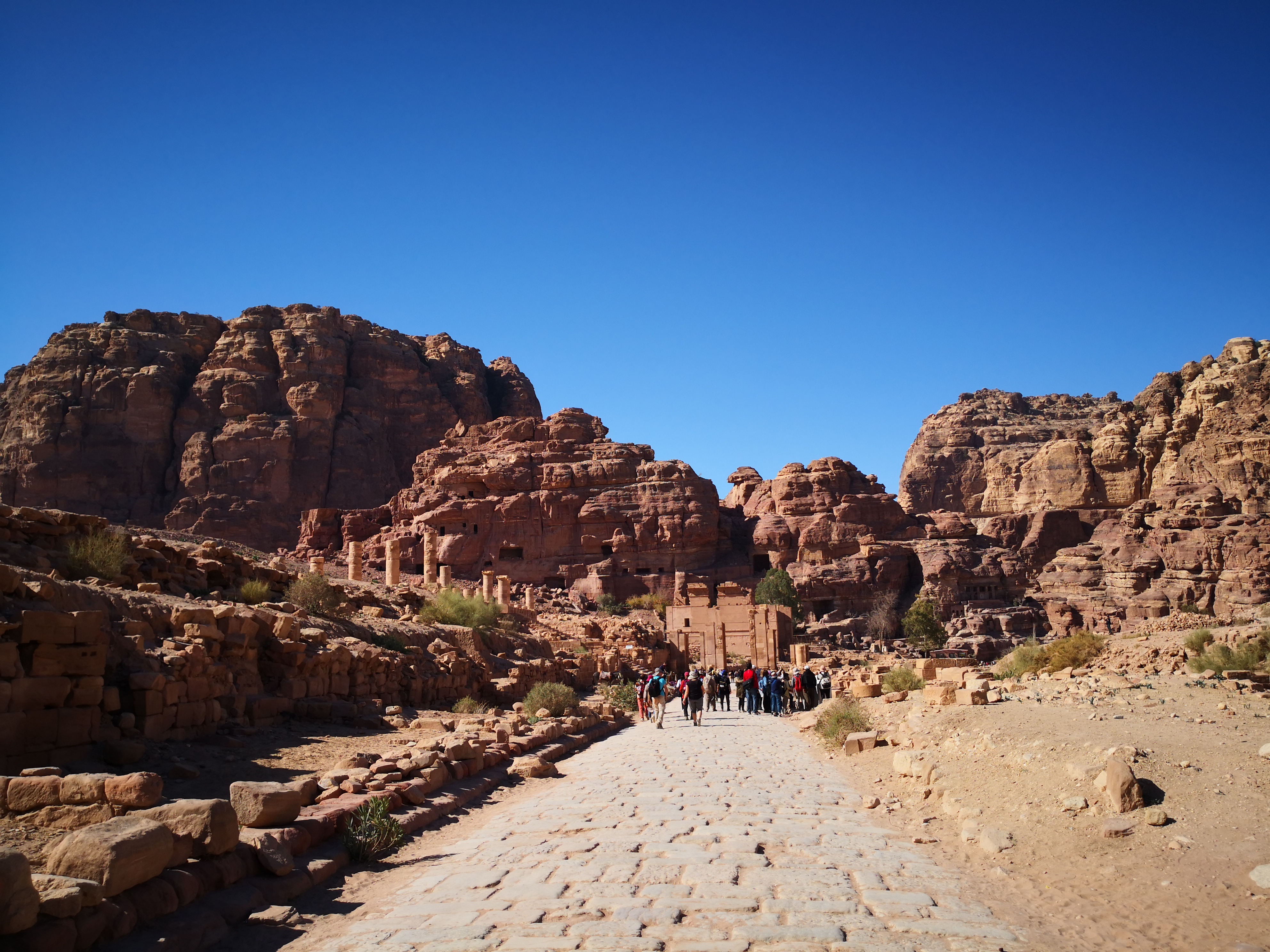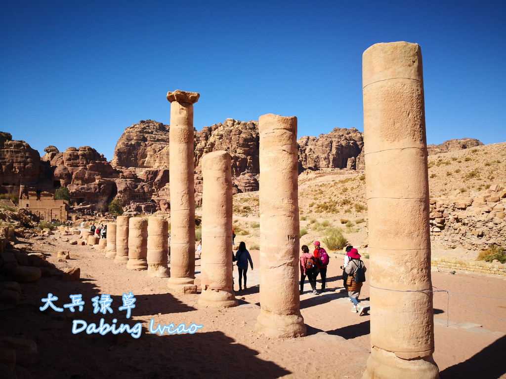 走过古罗马剧场,一条宽阔的古道自东向西延展过去,两侧残存着一些柯林斯石柱,这是著名的柱廊街(Colonnaded street),大街宽6米,是佩特拉古城的中轴线,两侧集中了神殿、宫殿、教堂、住宅和市场等,在罗马人时代是城市的政治、经济、文化和宗教中心。