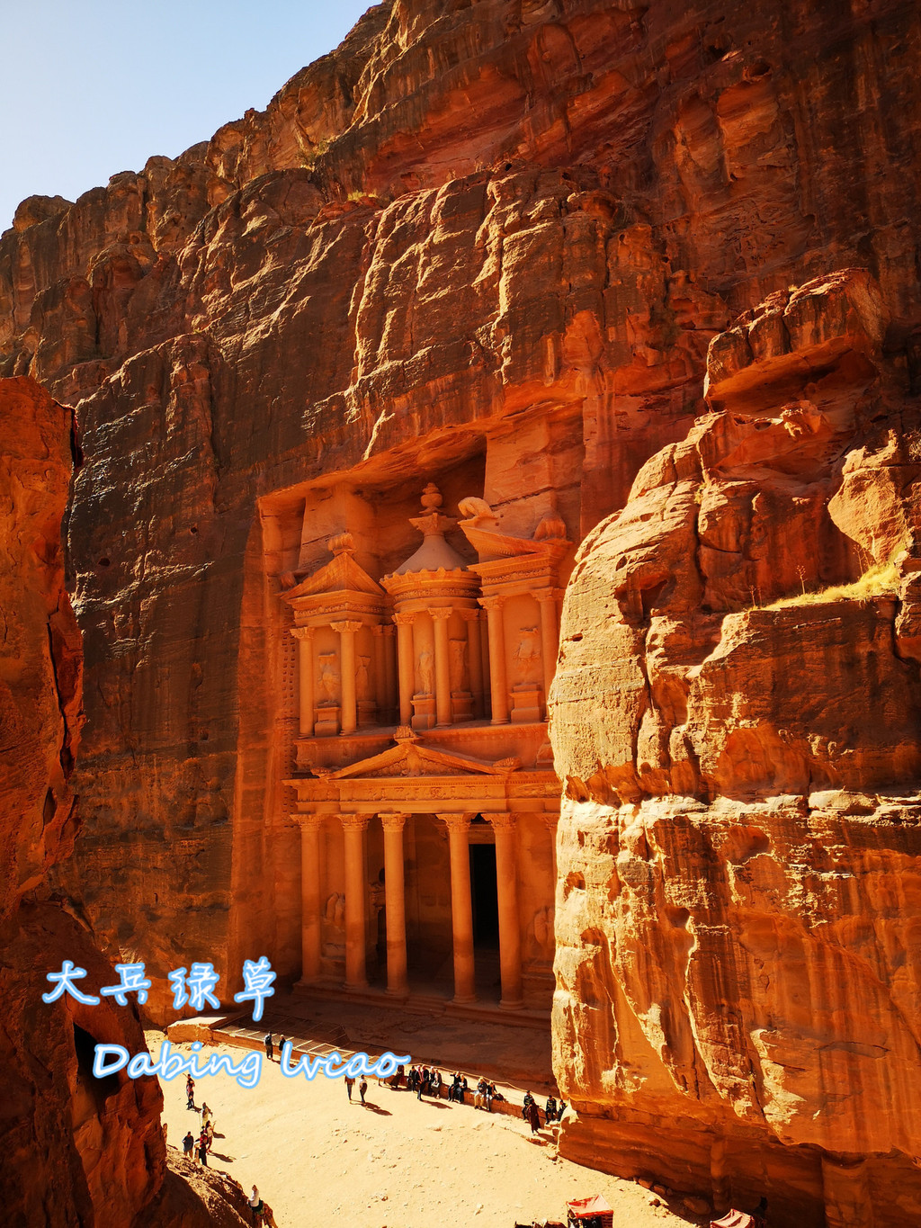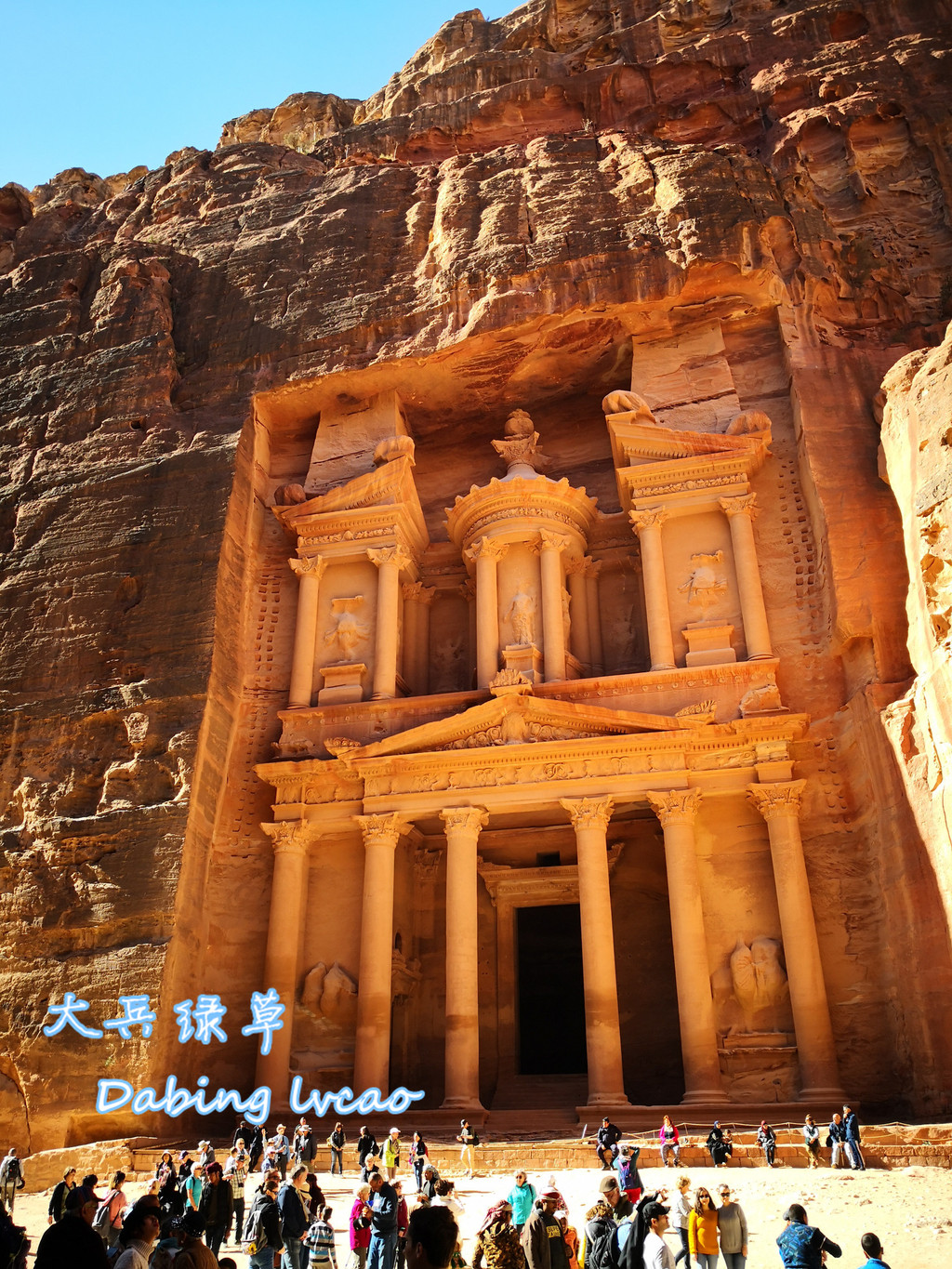 卡兹尼神殿(Al Khazneh)是宝藏之殿之意。当您在九曲十八弯的西克峡谷内行走了很长时间正疑惑时,前方峡谷尽头的狭窄山缝间若隐若现地闪现出玫瑰红的建筑模样,越往前走建筑的形象逐渐清晰,当您走到峡谷尽头时,眼前豁然开阔,一座巍峨壮观的石雕宫殿出现在您的面前,此时直接被震撼了,当时的感受难以言表。