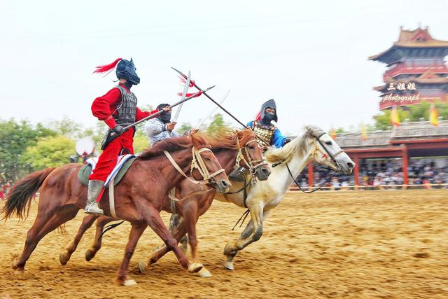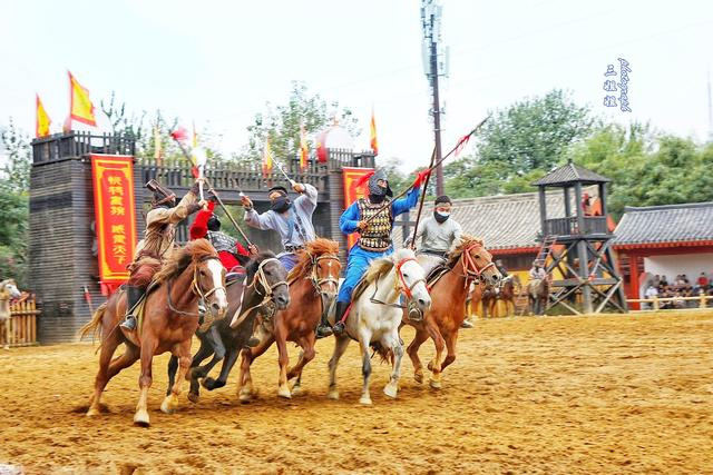 《岳飞枪挑小梁王》是清明上河园里不能错过的一场大戏。11点整,校场上战马嘶鸣,杀声如雷。演员们高超的马术功底令人惊叹不已,他们驰骋沙场,在疾驰的马背上刀枪剑戟,真实再现了千年古战场出生入死的情景。
