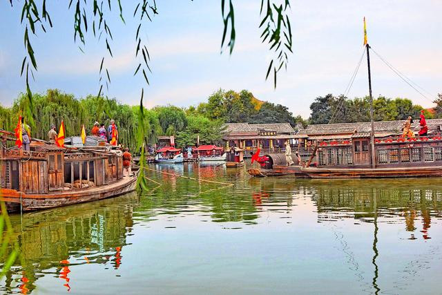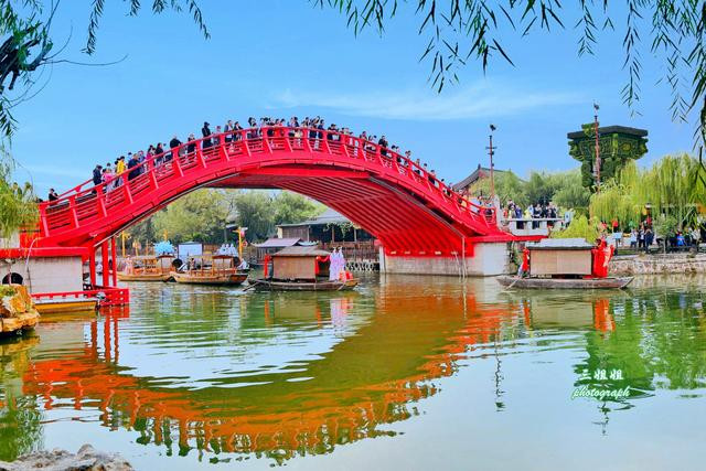 景区大门口有酒店接待处,而且有专门的摆渡小船把我送到了“满庭芳码头”,下了船细细打量,原来“满庭芳”位于缓缓流淌的汴水河畔,步行的话,需要翻过一座拱起的“鸳鸯桥”,客栈与景区隔水相望,闹中取静。