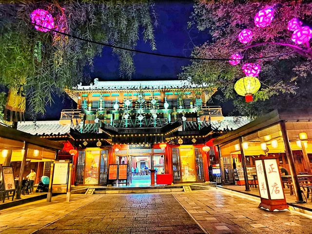 华灯初上,夜幕的降临。东京食坊热闹了起来,一家家小吃铺鳞次栉比,黄焖鱼、涮牛肚、炒凉粉、灌汤包,肉夹馍,米酒汤圆……,各种开封美食应有尽有。