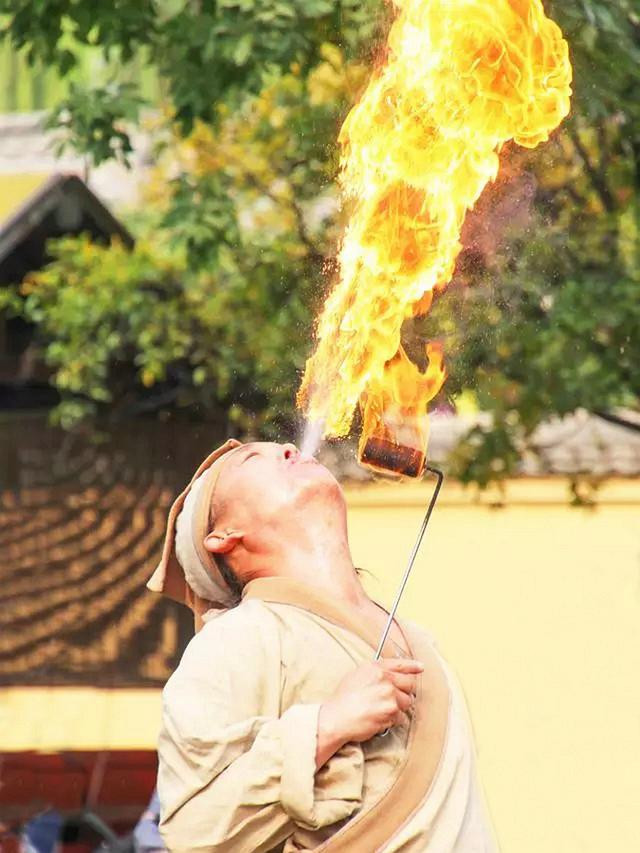 继续走吧,独行的灵魂。14点半我又跨过了“鸳鸯桥”,接着去清园邂逅一场接一场的演出。14点50分,刚走到东京食坊街口,就遇上了一位民间奇人的“气功喷火”表演。据介绍,气功喷火起源宋朝的京都汴梁,已有1000多年的历史了,不过如今会这种绝活的人是越来越少了。