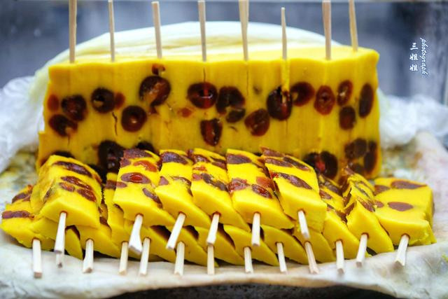 我买了一块挂着网红招牌的大宋切糕,里面夹着蜜枣,软软糯糯的,不知是用什么黄面做的,非常好吃。