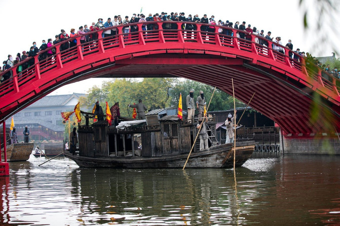 虹桥上可过人,下可行船,水路繁忙,河道上每天都在上演,货船遇到匪徒拦截,危机之时包拯出现,临危不惧地化解漕运风波的演出。