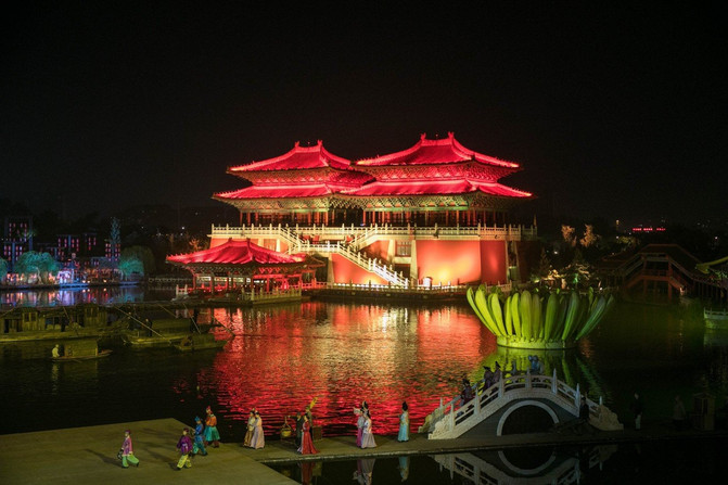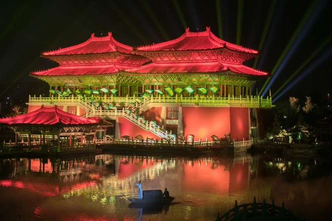 我们乘船游玩汴河之后前往观看《大宋· 东京梦华》,当夜幕降临,我们白天走过的路,走过的桥,都被灯光装扮,廊桥楼阁都变成了东京梦华实景的舞台。