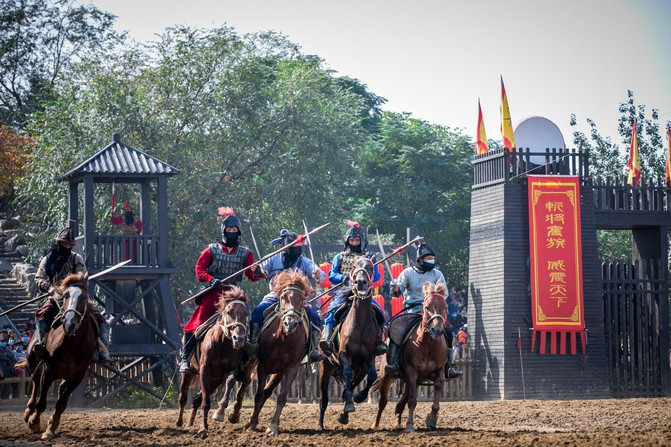 在马战过程中,非常佩服演员们高超的马术本领,他们驰骋沙场,刀枪剑戟,在疾驰的马背上真实再现了千年古战场你死我活的情景。把故事演绎得惟妙惟肖,博得游客的阵阵喝彩。这是内地很少见到的大型马战表演,固不容错过!