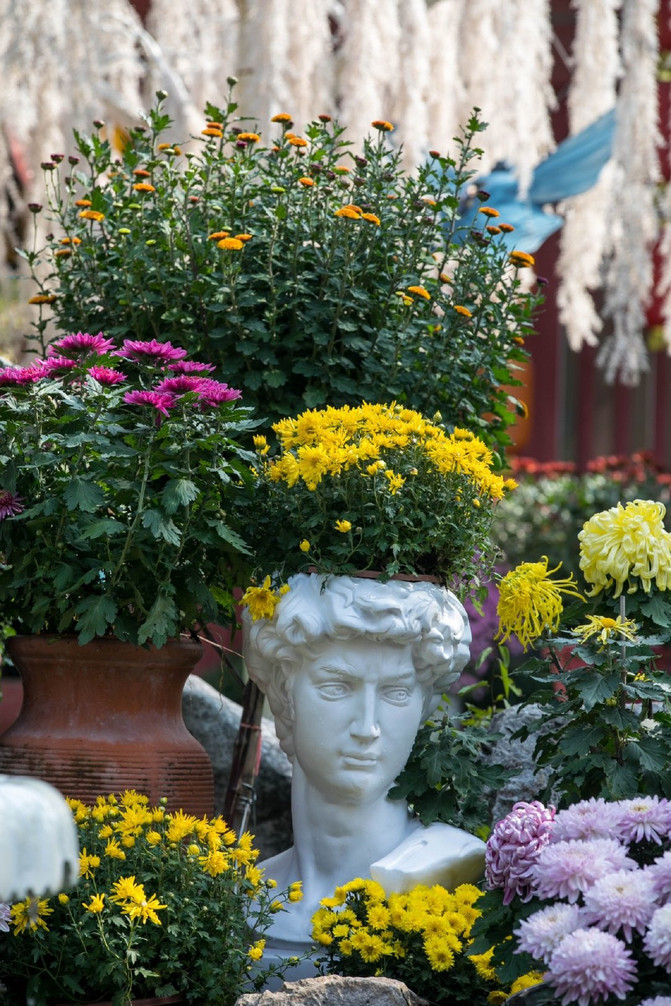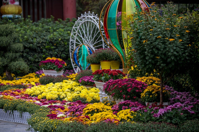 由于清明上河园是此次菊花文化节主会场之一,所以这次布展也别出心裁,利用山水造型在园内布置了多个展区,满足不同喜好的游客,也充分展示了菊花的多元化艺术表现力和国际菊花品种及栽培形式的多样性,在赏菊中了解菊文化。