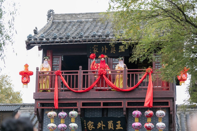 随着人流来到王员外府外,现场已被围得水泄不通,原来这个活动是可以众人参与抢绣球,抢到的就要和王姑娘“拜堂成亲”。这时候,我们都不是游客,也不是演员,而是参与招亲的大宋子民。这个项目让游人真正体验到大宋王朝的民俗文化。