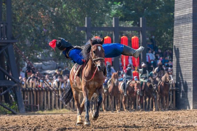 表演开始,马上倒立、马上平衡、马上站立、骑马射箭等特技表演吸引台前阵阵掌声。古代人骑马方式很多,适用于战争时期,给敌人于出其不备而战胜对方。