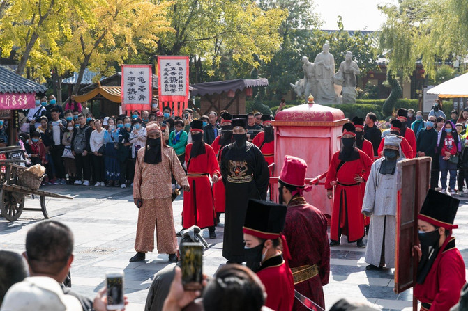 一到科举考试时间,四方院前就站满了游客,活动开始,大家踊跃举手报名,公公挑选三位来殿前考试,游客身着宋装,化身才子参加考试,最后选取状元,得到嘉赏。