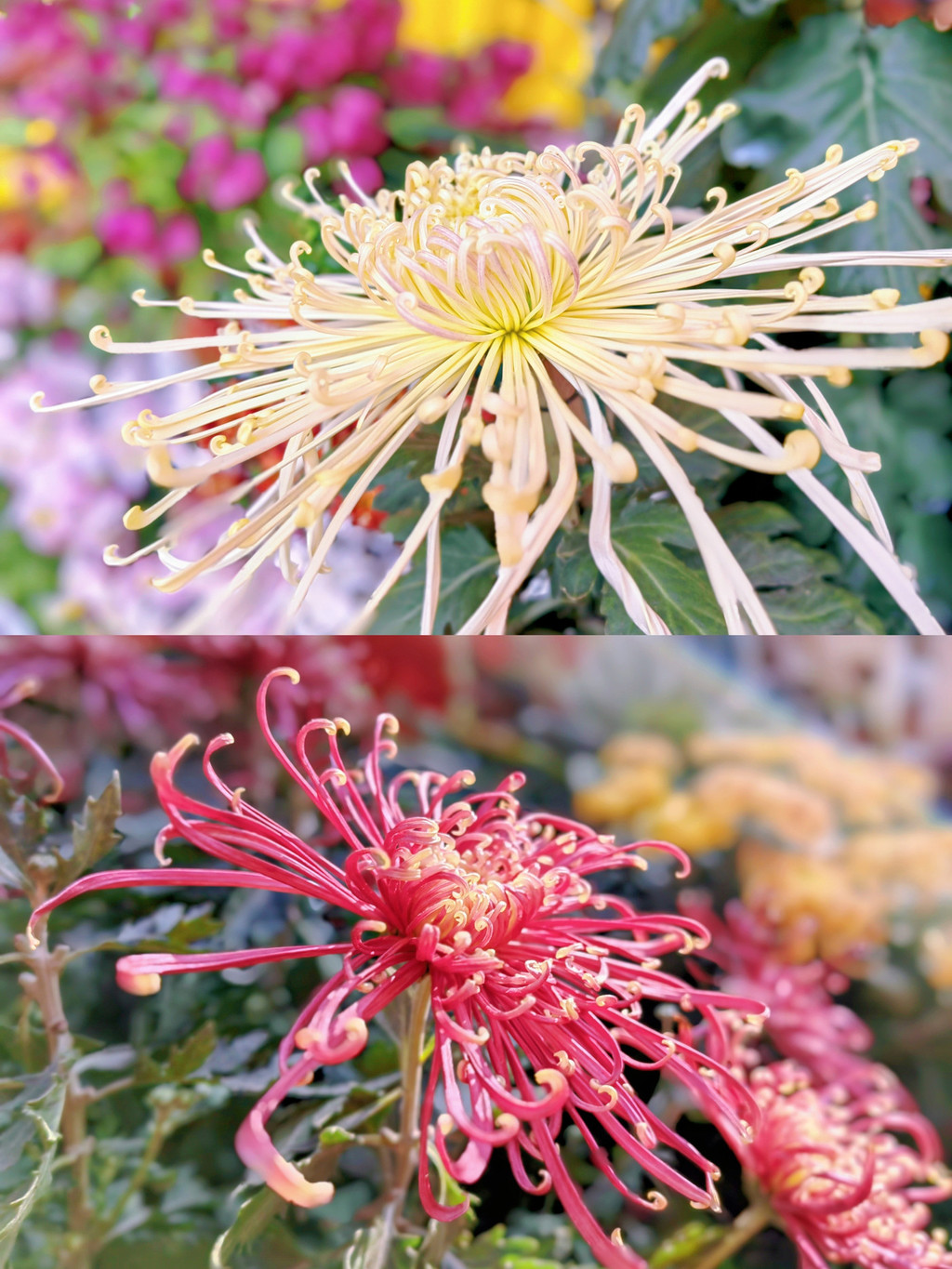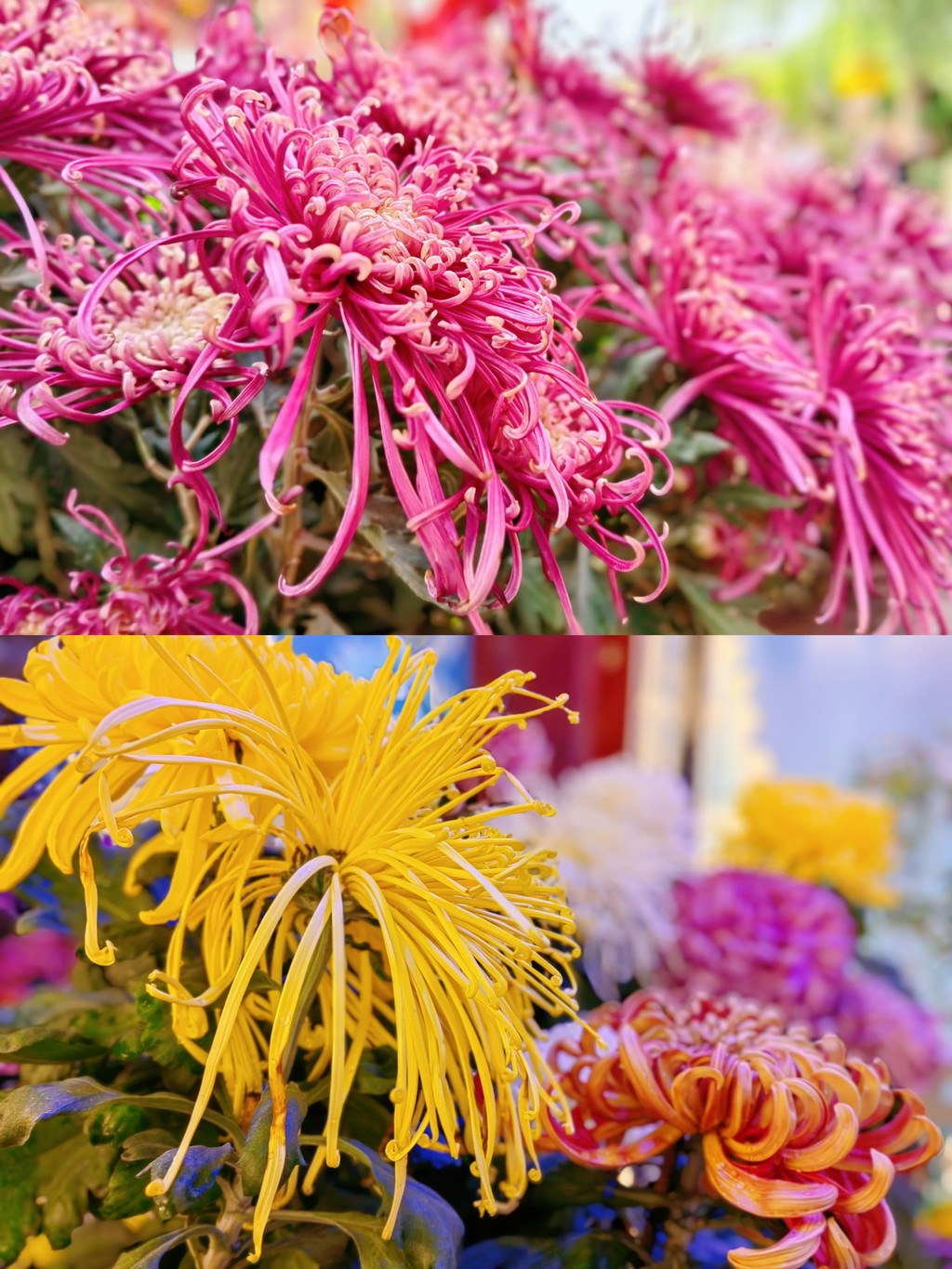 这里的菊花品种更是非常丰富。七彩炫菊、悬崖菊、独本菊、乒乓菊……,姿态万千,随风摇曳。红、黄、粉、白,如彩虹般绚丽,每一朵都有着自己的故事,每一片花瓣都是自然的杰作。