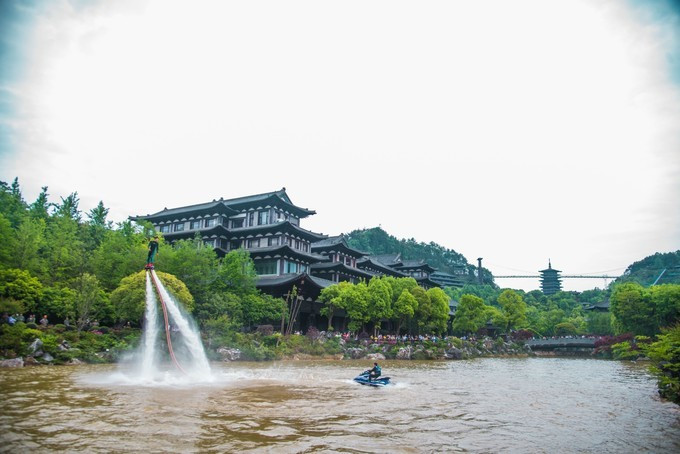 峰回路转,水光跃然,水幕电影在这片湖区之上,则以水这一佛法中构成一切色法的四种要素之一,以水之无形相万佛之景。照“五蕴皆空”,度一切苦厄。
