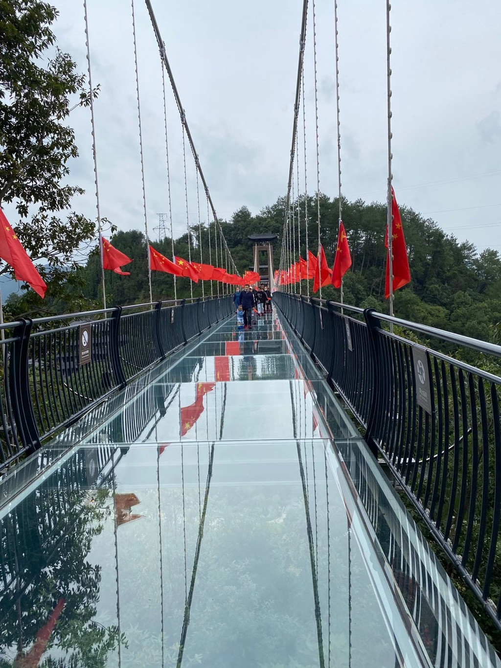 “来都来了,不上去瞧瞧总感觉亏得慌”,硬着头皮上了桥。过来人的经验告诉你:千万不要朝下看,不然你会和我一样吓得双腿直哆嗦,因为实在是高的渗人,有种把生命交给玻璃桥的飘然之感,但不得不说上面的风景还是不错的。