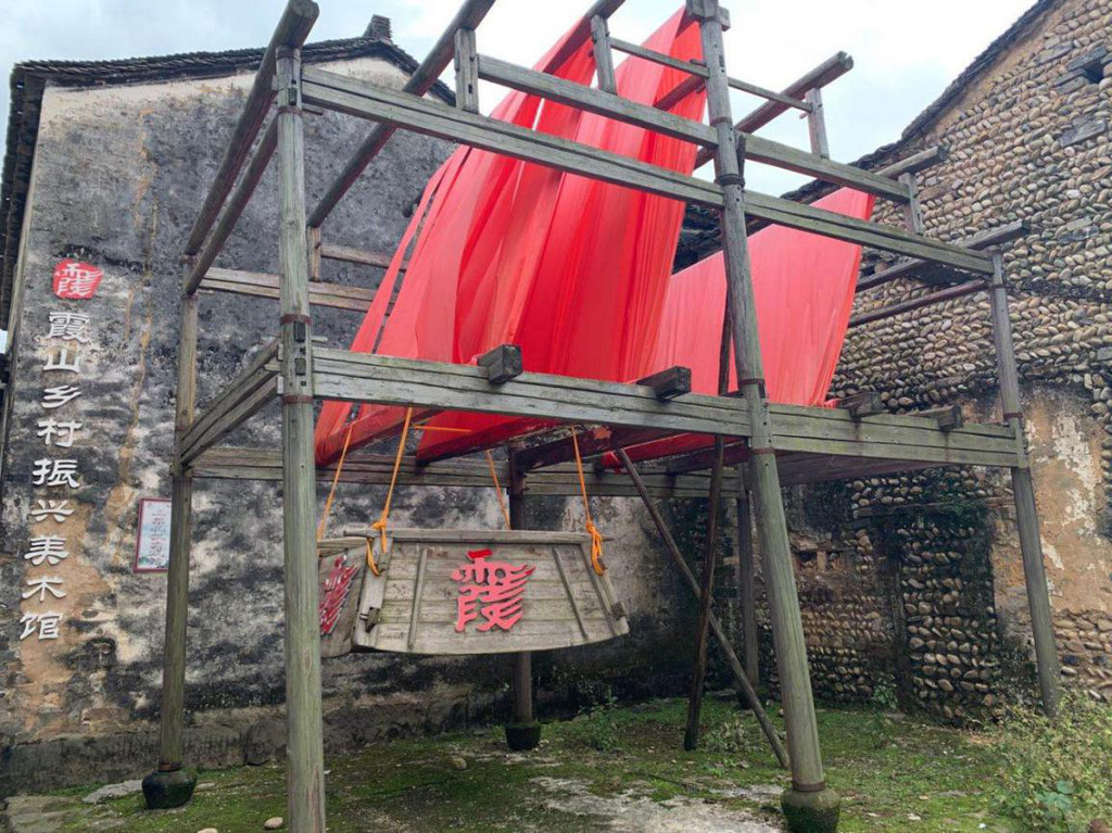 霞山村亮眼的景点还有霞山乡村振兴美术馆。古老的泥土房中间坐落着几根木柱子,三匹红织布挂在半空,像是红旗颜色,鲜艳极了。下面悬挂着的好似木箱子,近看又不是,正红色的“霞”印在其上,分外显眼。