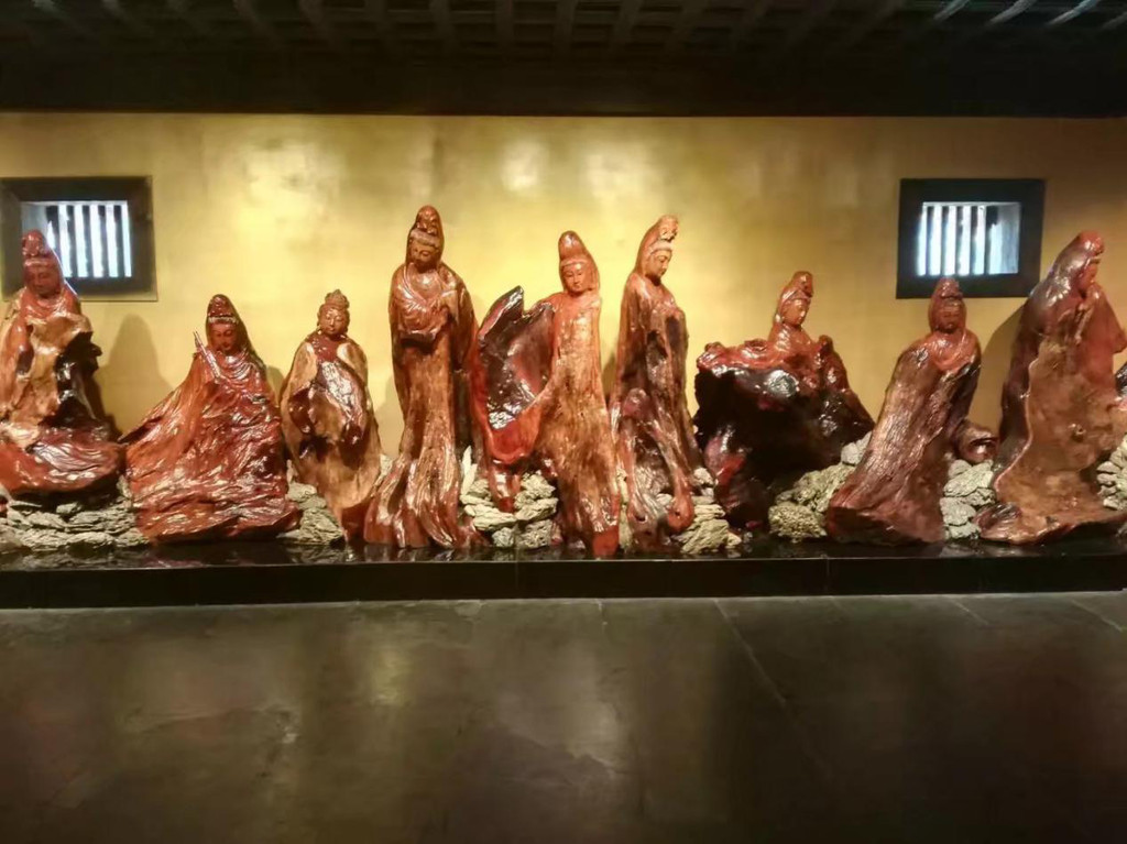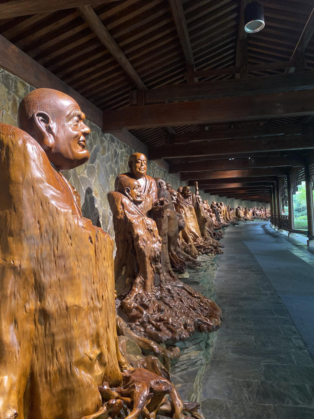 五佰罗汉更是徐谷青大师花了十余年的心思,精心雕刻而成的代表作品。暂且不说雕刻技术如何,光看这些数量,500罗汉呀,数量如此之多,就算是据好500多个木头也得花费不少时间,何况是如此精致的根雕艺术品。在大师的慧心妙手之下,五百罗汉真假难辨,仿佛真的罗汉就在眼前,分外传神。