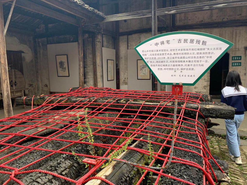 美术馆馆长诸人用红色的绳子将失火的古民居残骸捆绑起来放在馆内,变废品为艺术,处处都散发着艺术的气息。