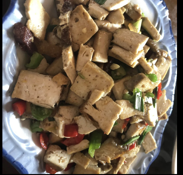阿姨邀请我们留下来尝一尝他们的手工豆腐,掺点肉沫,撒点红椒,再来点香葱增香,味道鲜美极了!