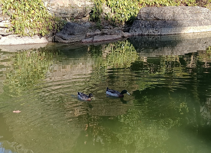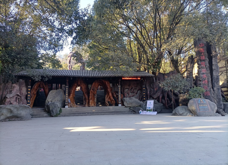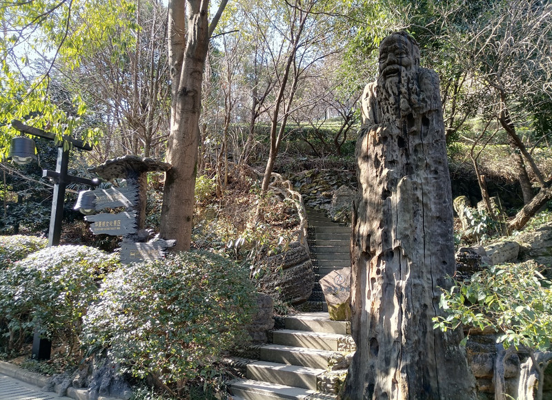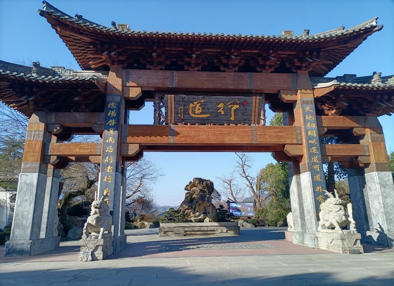 到了旅游区的半山腰,偌大的醉景园跃入眼中。园中罗列着的近百种名木盆栽,大多在寒冬中凋零,只剩下光秃秃的树干,唯有几棵松树和梅树抗住了严寒,肆意的展现着那股傲劲。园中的一汪湖水不知道为什么看起来格外的绿,在湖中戏水的鸳鸯时不时溅起阵阵涟漪。看到牌楼上醒目的“道行”两字,反观自身过往,开始陷入了沉思。
