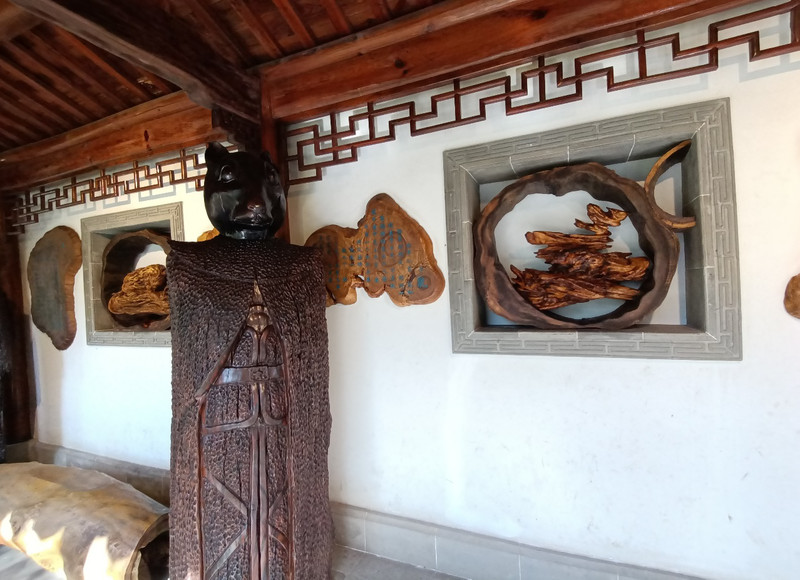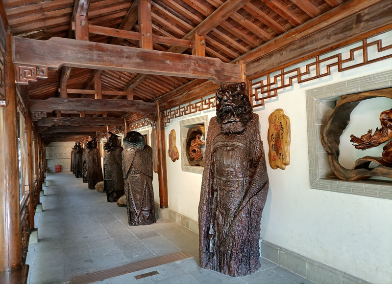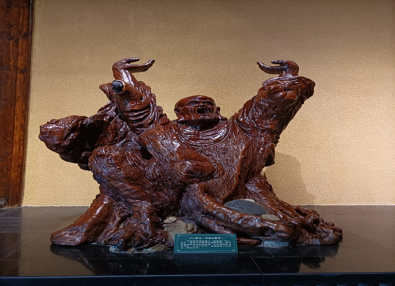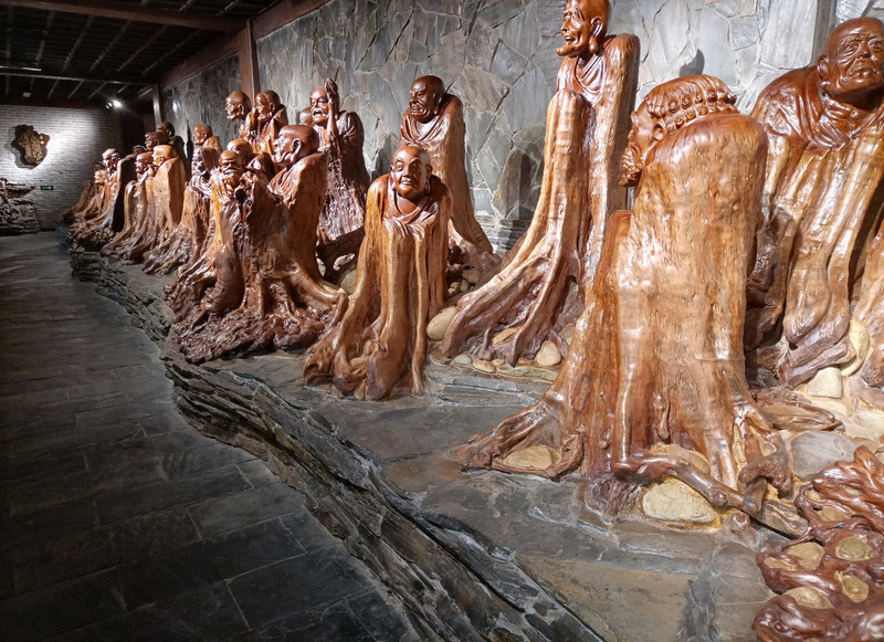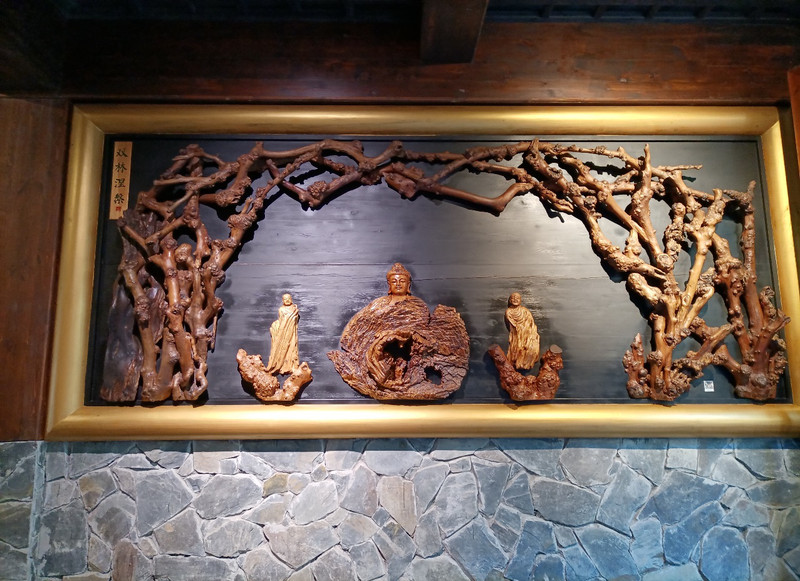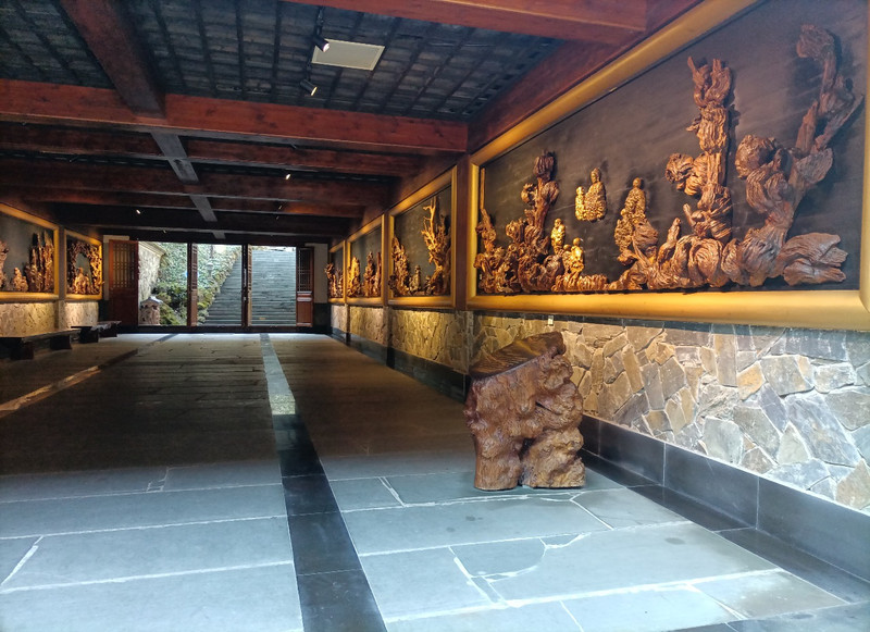 走出大雄宝殿,继续往上爬,途径禅廊。禅廊中挂着的五子戏佛、逾域出家、达摩悟禅等壁画均由根雕创作过程中的边角料制成,创作者将根雕艺术融入书画艺术中,两者刚柔相济,交织成眼前动人的根雕画作。