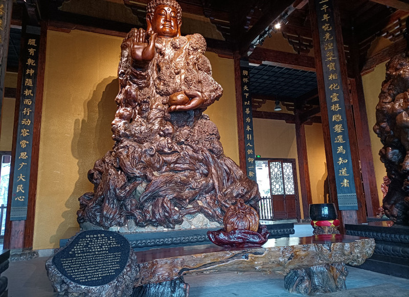 层层向上,不知不觉已至大雄宝殿。殿内中间高达10米,由黄心楠制成的释迦牟尼佛是整个根宫佛国景区最大的一座根雕佛像。作为佛教的创始人,释迦牟尼四字寄托了佛教徒对他能仁、能儒、能忍、能寂的赞颂。殿内共有文殊菩萨、迦叶尊者、阿难尊者、迦里迦尊者、伴诺迦尊者等共28件巨型根雕艺术作品。