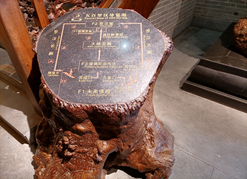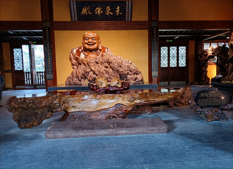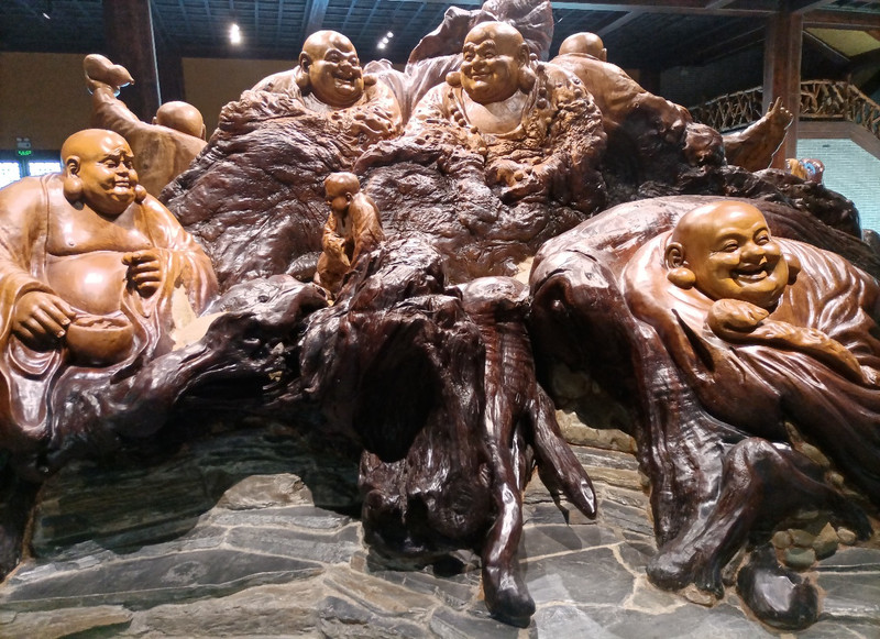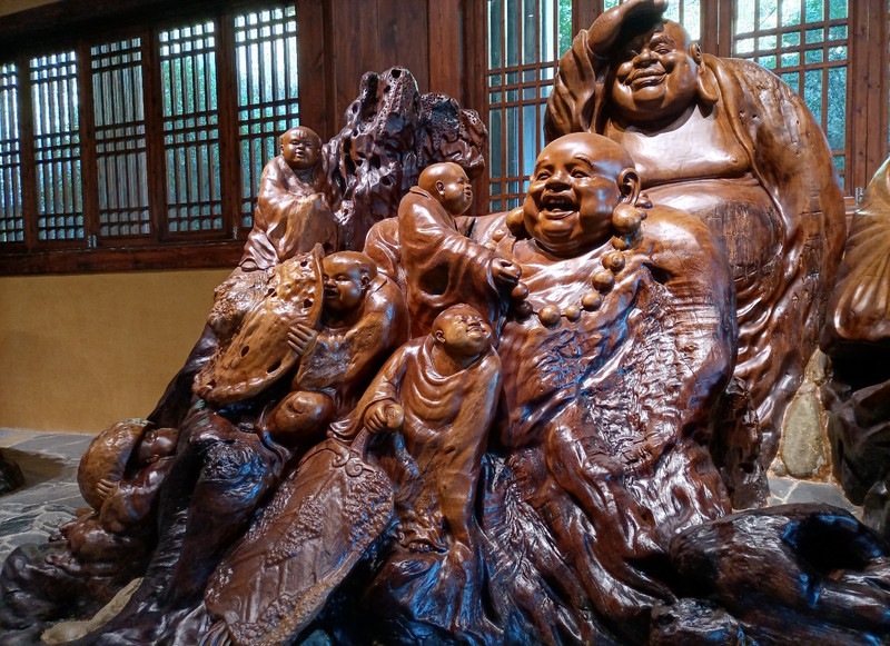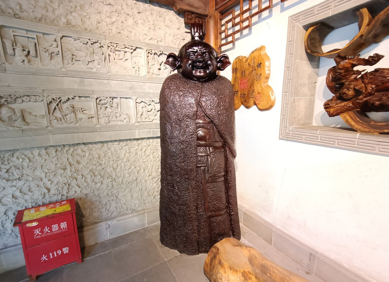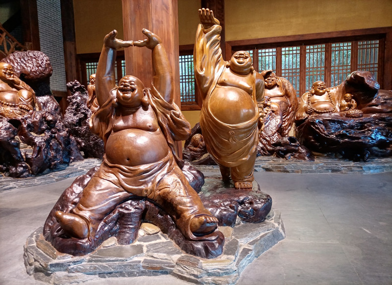 一路向上来到了开心佛殿,开心佛便是形容殿内腆着肚皮、开怀大笑的弥勒佛们。作为中国大乘佛教八大菩萨之一的弥勒佛常被安排在寺庙大门口,扮演着“迎宾佛”的角色。凭其“大肚能容,容天下难容之事,开口便笑,笑世间可笑之人”的佛系思想,有弥勒佛在的地方香火一定是大旺的。我国石雕弥勒佛较为常见,殿内如此大规模集中风格迥异、出神入化的根雕弥勒佛在世界范围内也较为罕见。