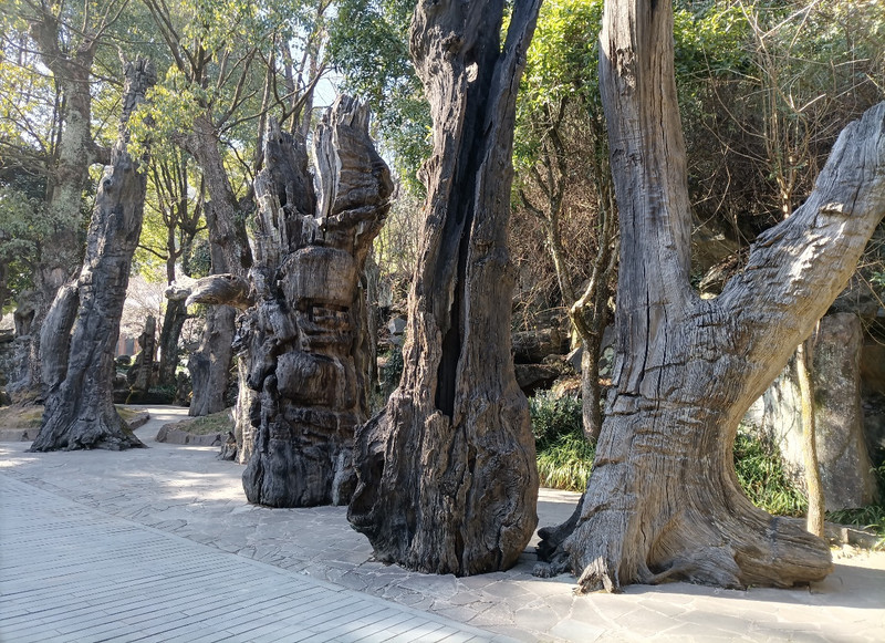 从景区正门口进入没走几步远,一片枯木林拔地而起。在大自然鬼斧神工之力的雕琢下,枯木上的沟壑,或像严肃的树神,或像裂了口的悬崖……正所谓“一千个读者眼中就会有一千个哈姆雷特”。不远处依山傍水的月老,眯缝着双眼,嘴角上扬定是又撮合了不少人间姻缘。