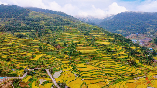 秋天正是丰收的季节,梯田染上了金黄色,层层梯田遍布山头,穿着苗服在梯田上拍照,怎么拍都好看。