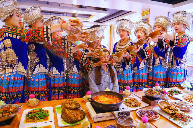 五湖四海是苗族迎接客人的最高礼仪,跟高山流水不同,五湖四海有九个苗族阿妹,一边五个另一边四个,苗家自酿的米酒很甜,但是源源不断的米酒灌下来,保证喝到你怀疑人生。