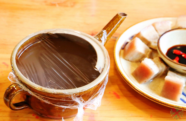 鼓藏肉就是水煮五花肉,是苗族人过鼓藏节的硬菜,寓意“金银财富”。经过水煮的黑毛猪肉,块头大看起来肥腻,我喜欢放在酸汤里煮一下,再沾上酱料来吃。