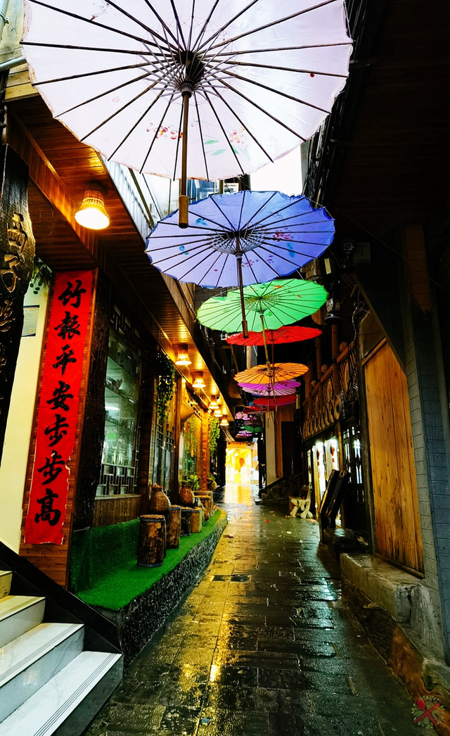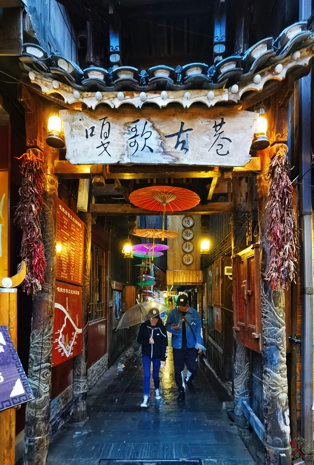 嘎歌古道巷窄楼高,头顶挂满了彩色纸伞,在黑色吊脚楼衬托下,显得格外艳丽夺目。傍晚灯光亮起,把嘎歌古道衬托得美轮美奂,在这里拍低角度照显得人美腿长。