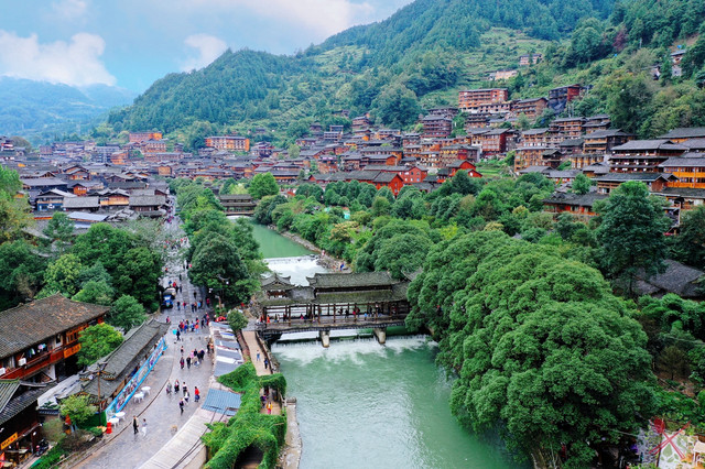 苗寨讲究依山傍水,一般都会在溪河上修建风雨桥,既可以关风蓄气和挡风遮雨,又能祈求风调雨顺、五谷丰登。