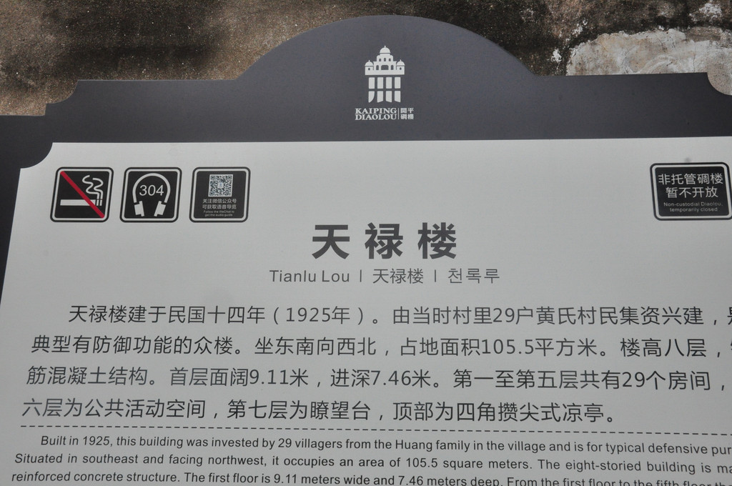 天禄楼,是民国十四年(1925年)由29户村民集资兴建,为典型的众楼。该楼高7层21米,为钢筋混凝土结构。第1至5层共有29个房间,每个集资户各有1间,当时每到傍晚,集资户男丁均入住楼里以防匪盗绑架;第6层为公共活动空间,第7层为了望亭。登楼环顾,四周景色美不胜收。据记载,1963年、1965年、1968年开平连续发生3次大水灾,洪水漫过民居屋顶,村民登楼得以避难。