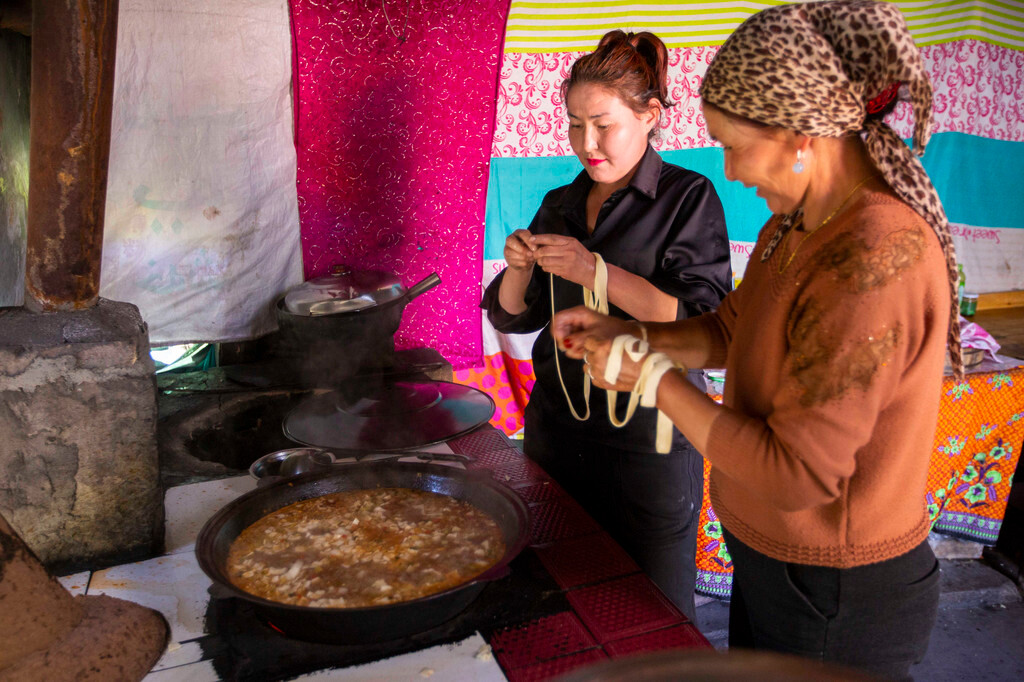 就餐,哈萨克牧民家中,热情好客。这种做法的面食好像加拉条子?
