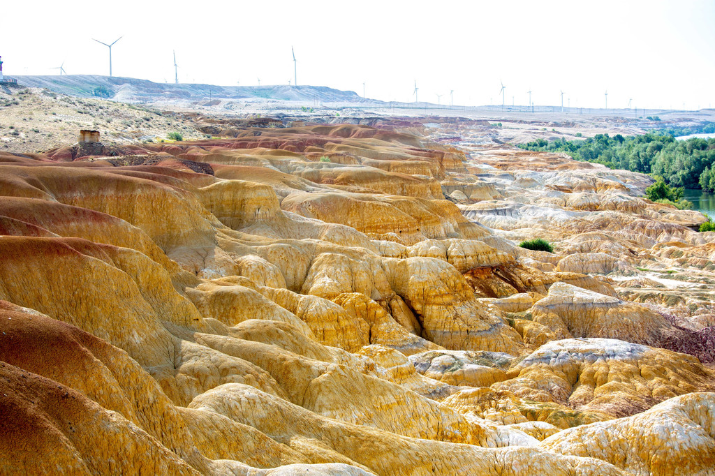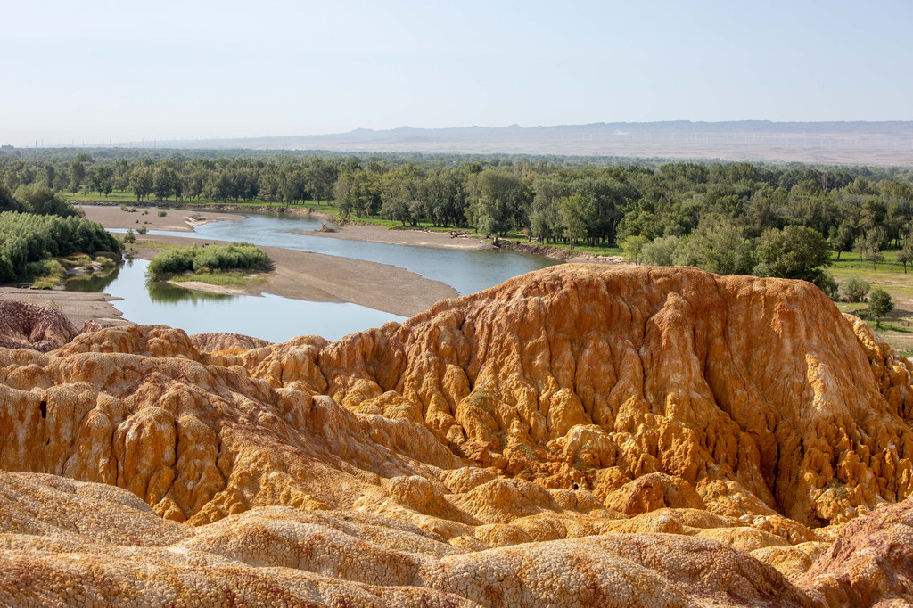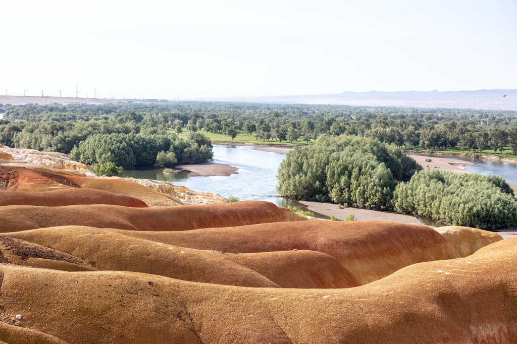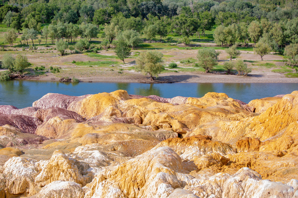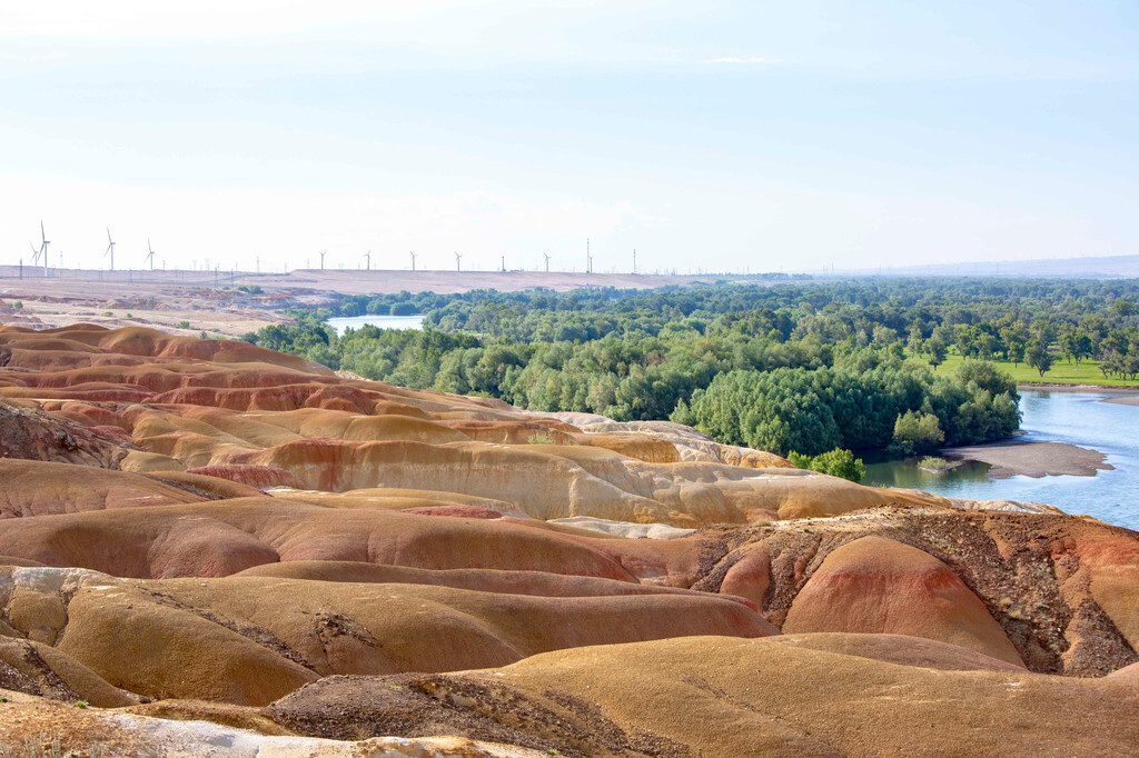 它毗邻碧波荡漾的额尔齐斯河,与对岸葱郁青翠的河谷风光遥相辉映,可谓“一河隔两岸,自有两重天”。河岸岩层抗风化能力强弱不一,轮廓便会参差不齐,而岩石含有矿物质的不同,又幻化出种种