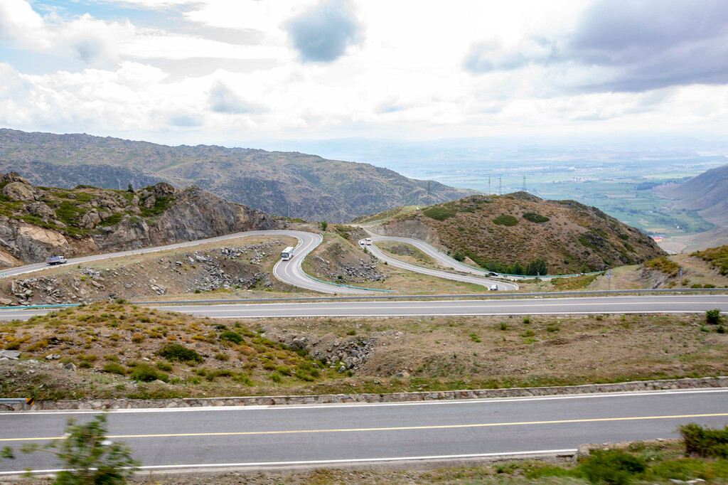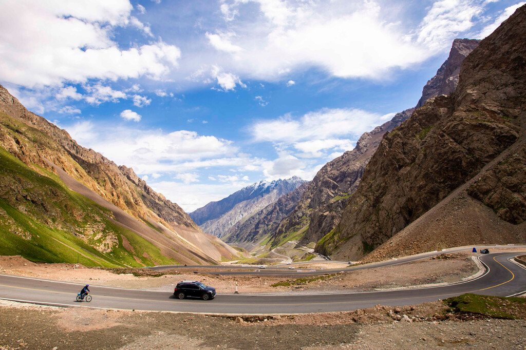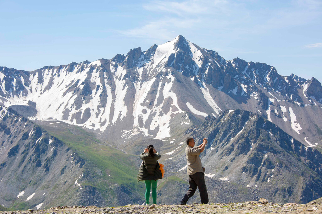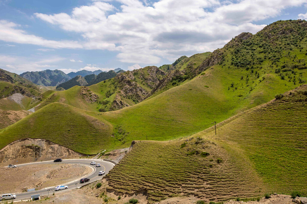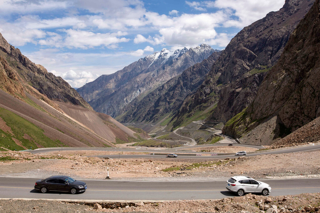天山,呈东西走向,绵延中国新疆境内1700千米,占地57万多平方千米,占新疆全区面积约1/3。中国境内的天山山脉把新疆大致分成两部分:南边是塔里木盆地,北边是准噶尔盆地,与喀喇昆仑山、阿尔泰山行程独特的“三山夹两盆”地形。