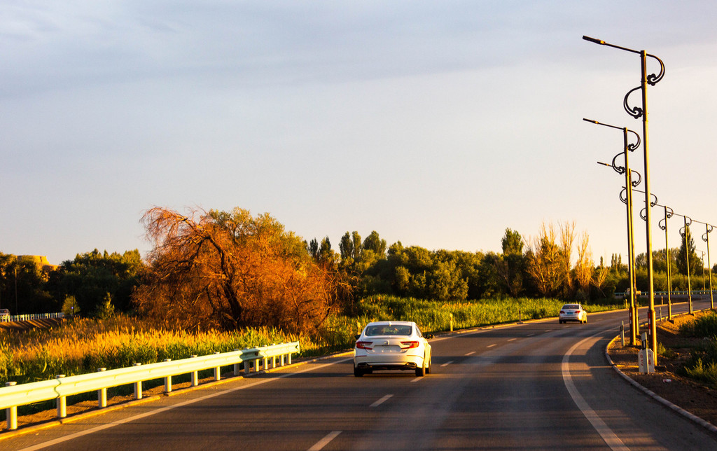 已经是晚上十点来钟,公路上金灿的阳光仍舍不得退去。