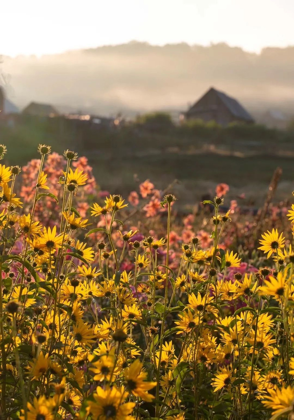 晨雾如纱,静静地浮在禾木村上,整个村庄静谧而安详。阳光被群山阻隔,无法洒遍整个村庄,只能照亮高耸的白桦树,为稀薄的晨雾渡上浅浅的金色,层次感极强。
