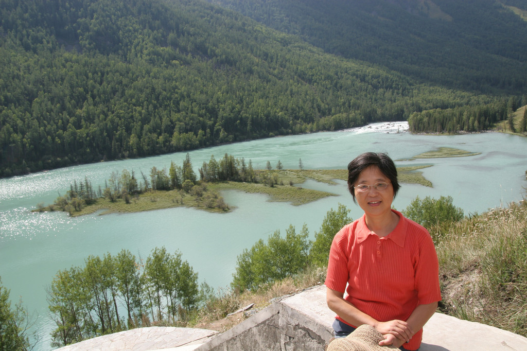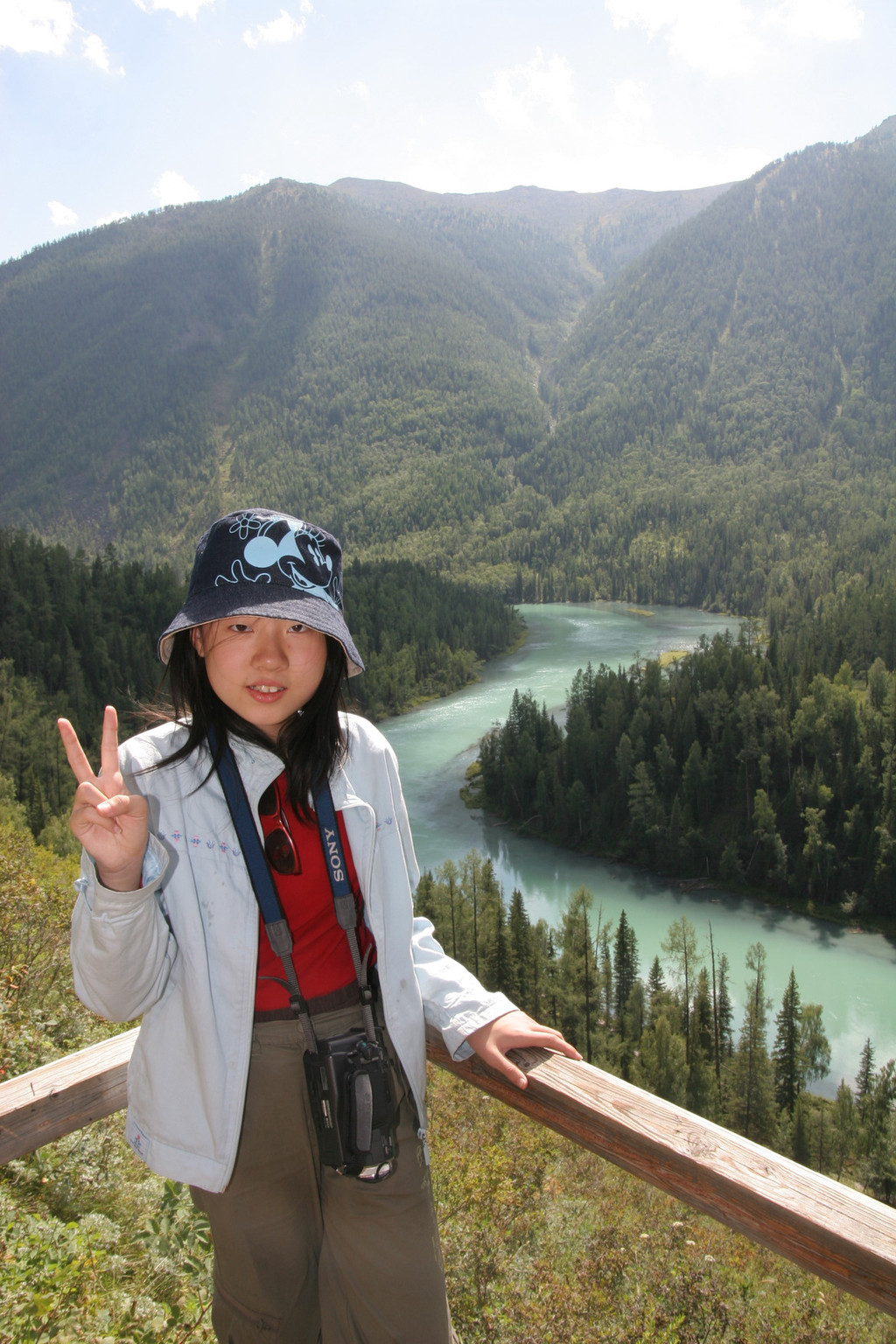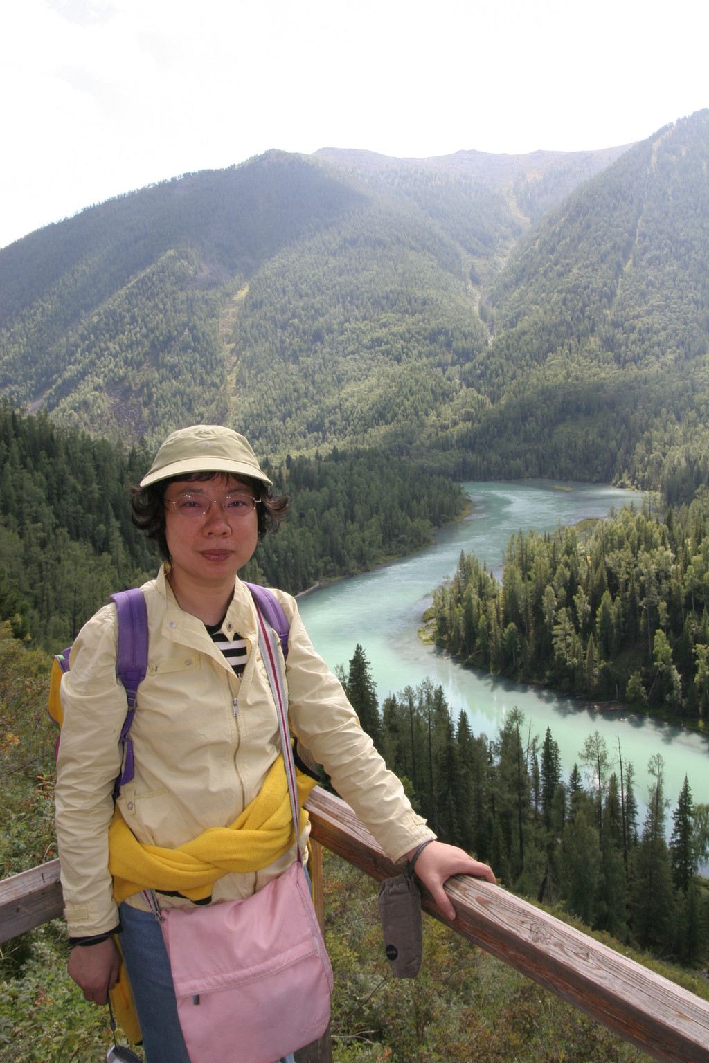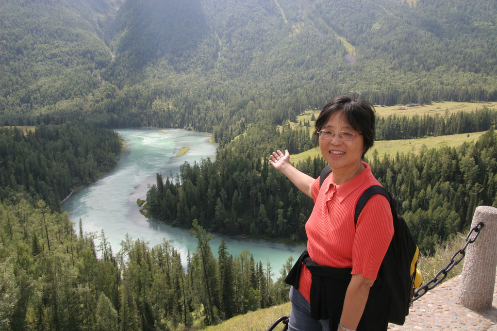 我们决定先去“观鱼亭”看喀纳斯湖,而后再往回一路游览。摆渡车载着我们沿喀纳斯河盘山而进。坐在车上,向上看,陡峭的山上植被郁郁葱葱;向下看,浅蓝色的河水奔腾流向后方。车每到一景点都有游客上下,看到卧龙湾、月亮湾、神仙湾、鸭泽湖等美丽的景色,有一种想下车的冲动,但还是自我安慰着:我们回来时会到这里的。