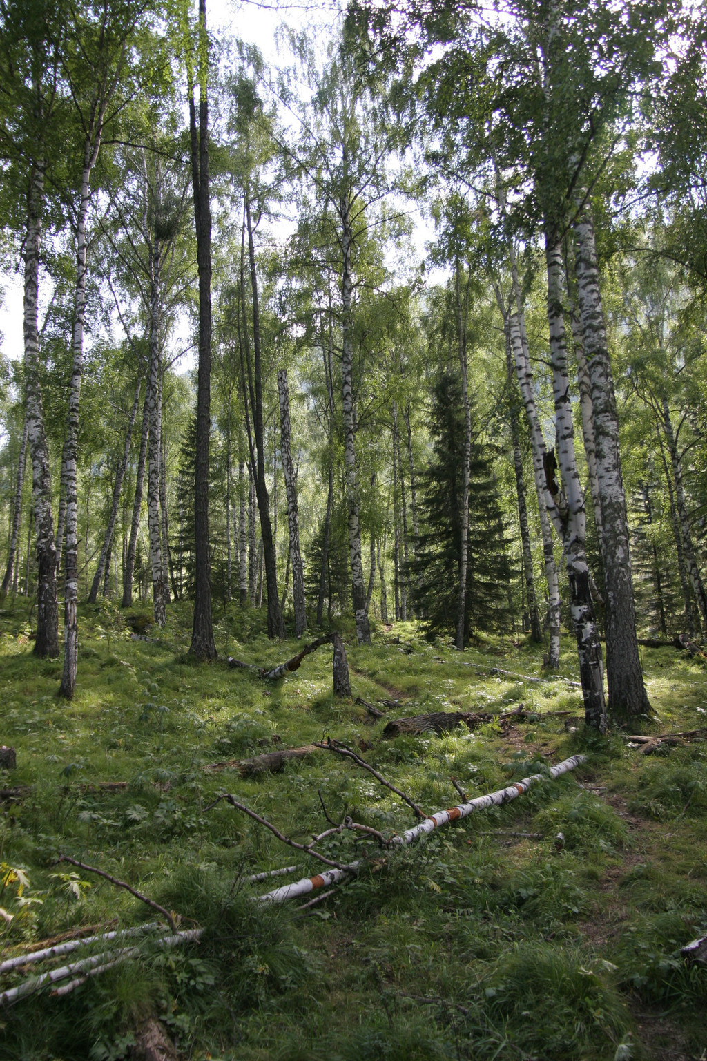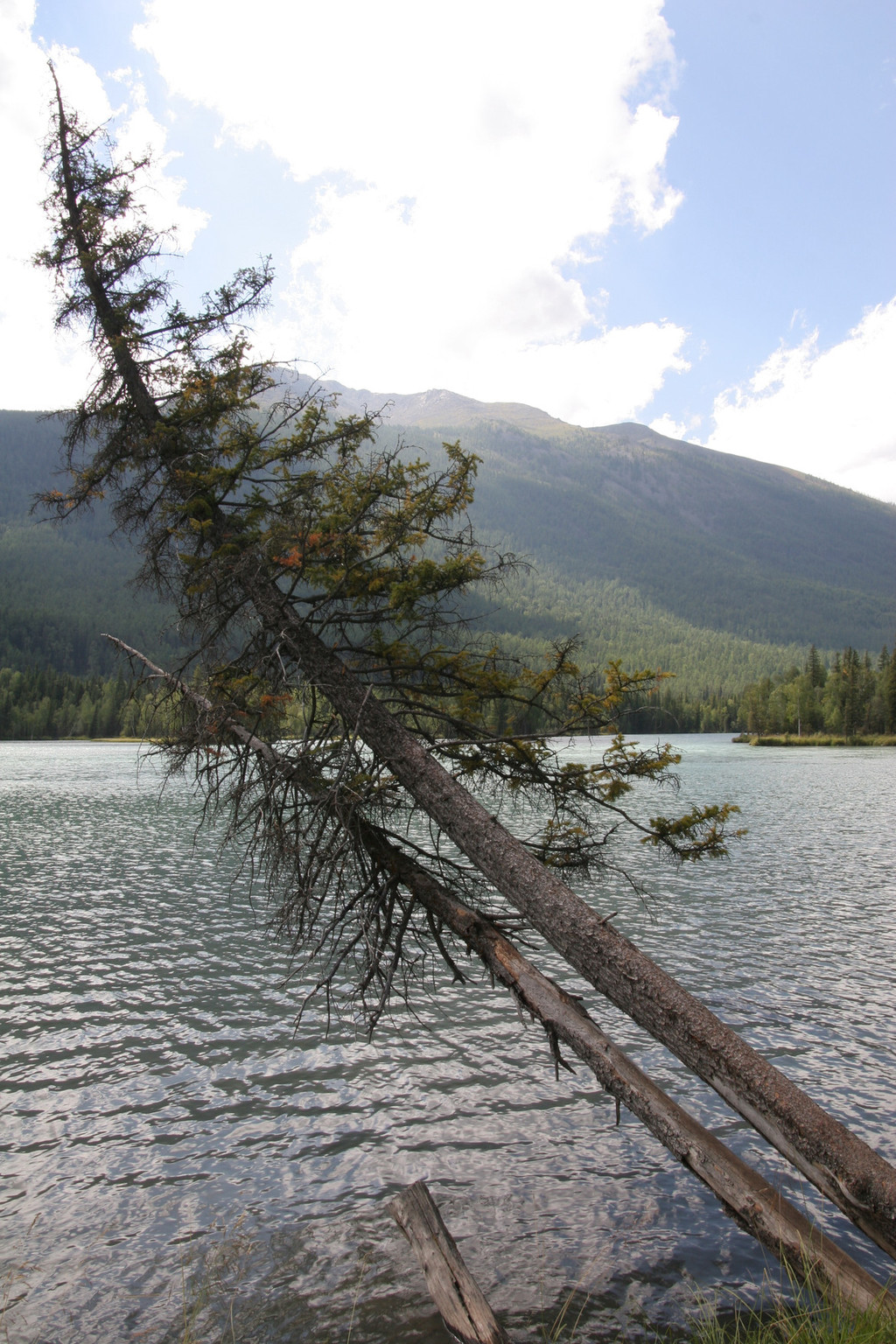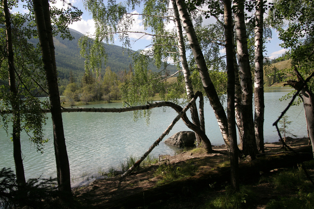 我继续沿河边的台阶向纵深走,阳光透过白桦树林斜射在零落的枯枝残叶上;枯死的树木不规则地倒在林间和岸边,纵横交错;喀纳斯河水在微风的吹拂下,泛起阵阵涟漪静静地在旁流过。一切都显得那么原始,那么恬静。